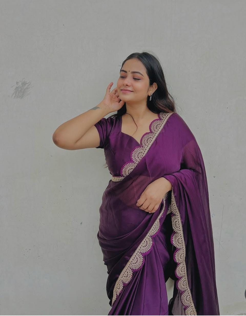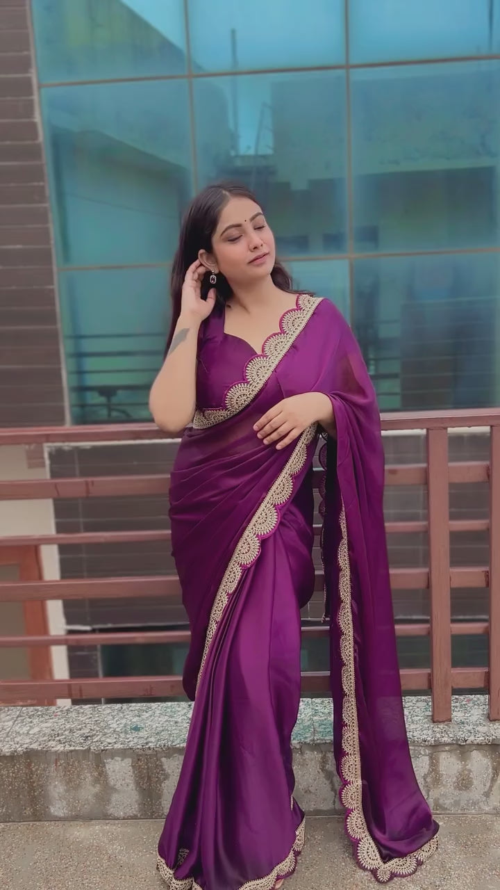 Purple Embroidered Satin Chiffon Saree
