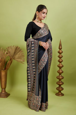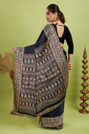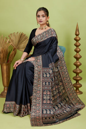 Experience timeless elegance with this Semi Gajji Original Ajrakh Saree. Crafted from Gajji Soft Silk, it offers a luxurious yet comfortable drape. The intricate Ajrakh prints combined with the rich texture of Gajji silk make this saree perfect for festive occasions, traditional events, or weddings.