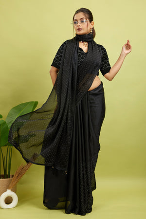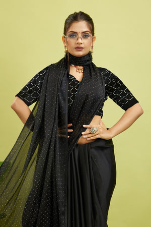 This elegant saree crafted from satin chiffon offers a graceful drape and a smooth, flowing texture that enhances your silhouette. Paired with a satin blouse, it provides a comfortable and sleek fit. Both the saree and blouse are adorned with intricate stone work, adding a subtle sparkle and sophisticated detail perfect for special occasions. Ideal for those seeking a refined blend of comfort and style.