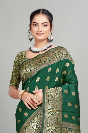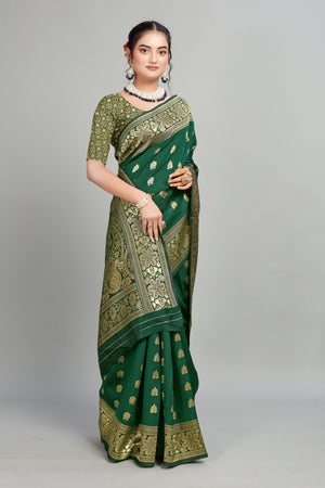 This saree is crafted from soft Silk Blend cloth, offering a luxurious and comfortable drape. It features an exquisite rich pallu adorned with detailed jacquard work that extends throughout the fabric, enhancing its elegance. The accompanying blouse is designed with an exclusive jacquard border, perfectly complementing the saree’s intricate patterns. Ideal for special occasions, this ensemble combines traditional craftsmanship with refined aesthetics.