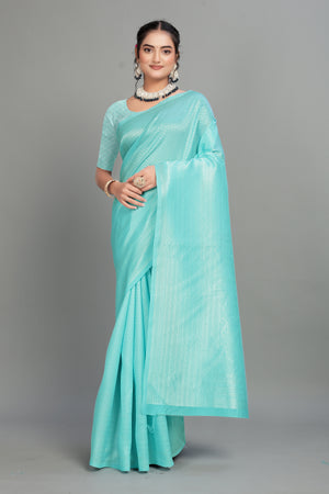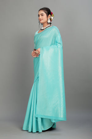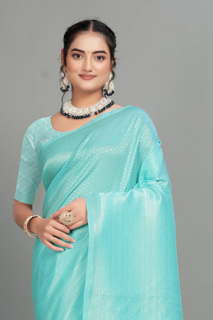 Experience elegance with this soft Silk Blend saree featuring a rich pallu and intricate jacquard work throughout. The exquisite design enhances its luxurious texture, making it perfect for special occasions. Complemented by a blouse with an exclusive jacquard border, this saree offers a refined and sophisticated look that stands out with quality craftsmanship.