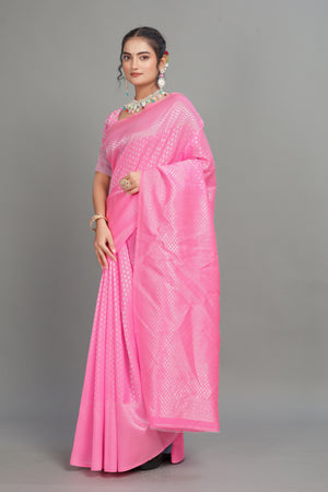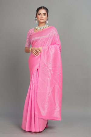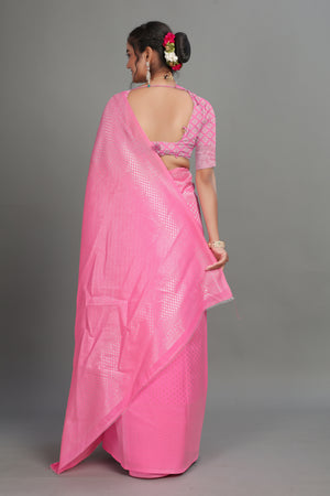 Crafted from soft Silk Blend, this saree features a beautiful rich pallu adorned with intricate jacquard work throughout, enhancing its elegance. The blouse complements the ensemble with an exclusive jacquard border, adding a refined finish suitable for special occasions. This combination of luxurious fabric and detailed design ensures both comfort and a sophisticated appearance.