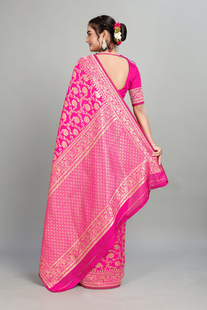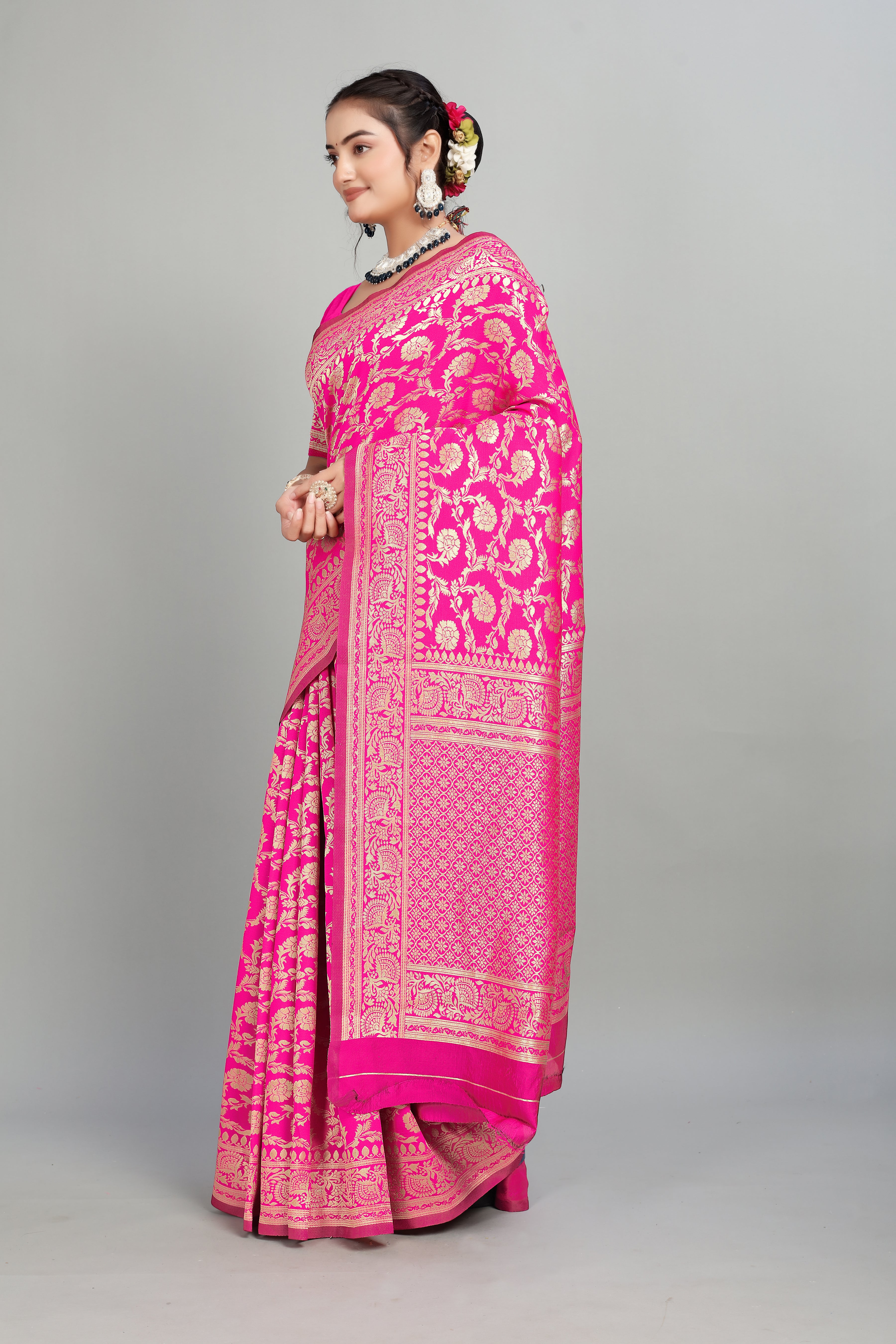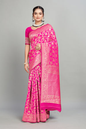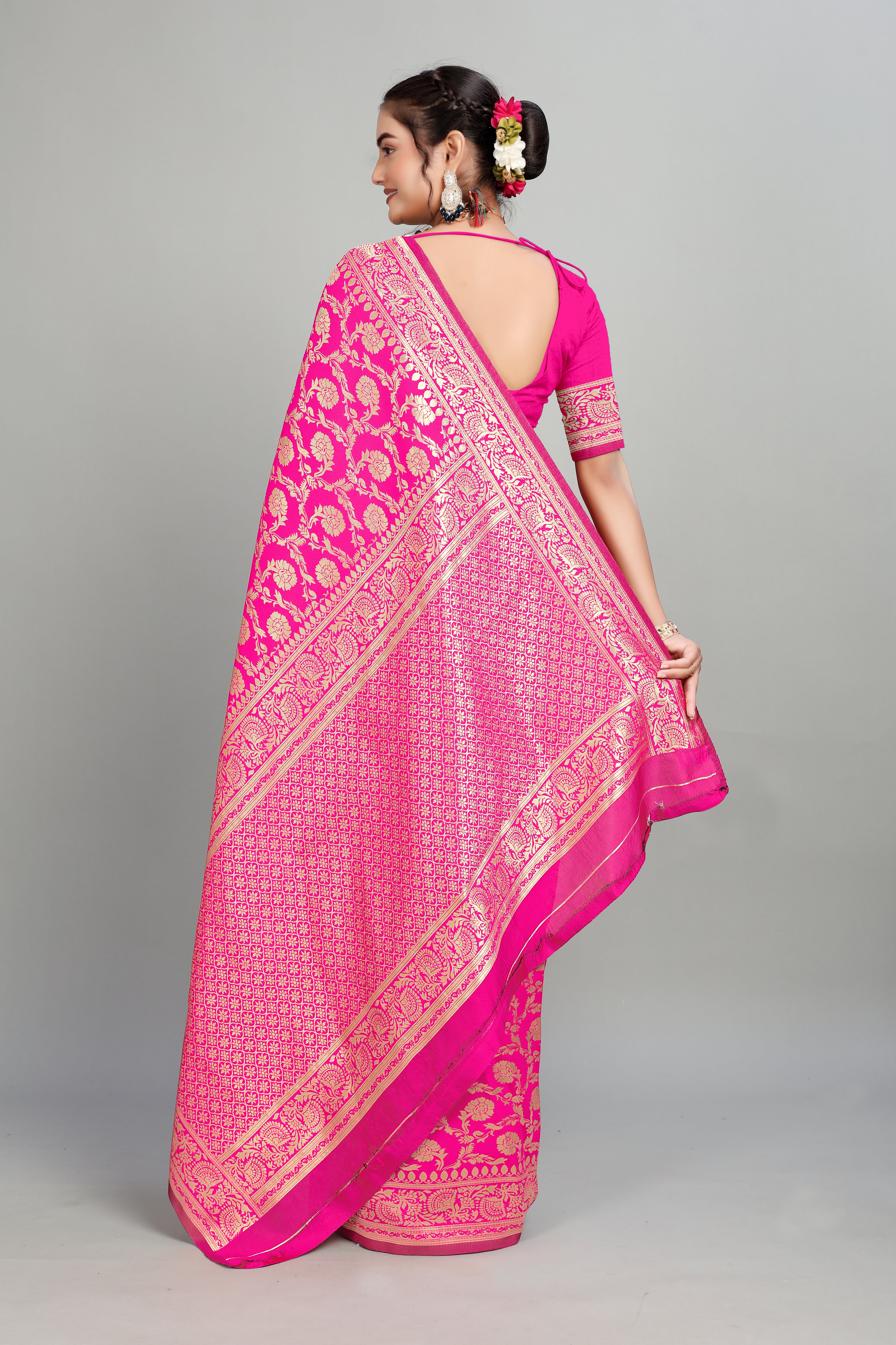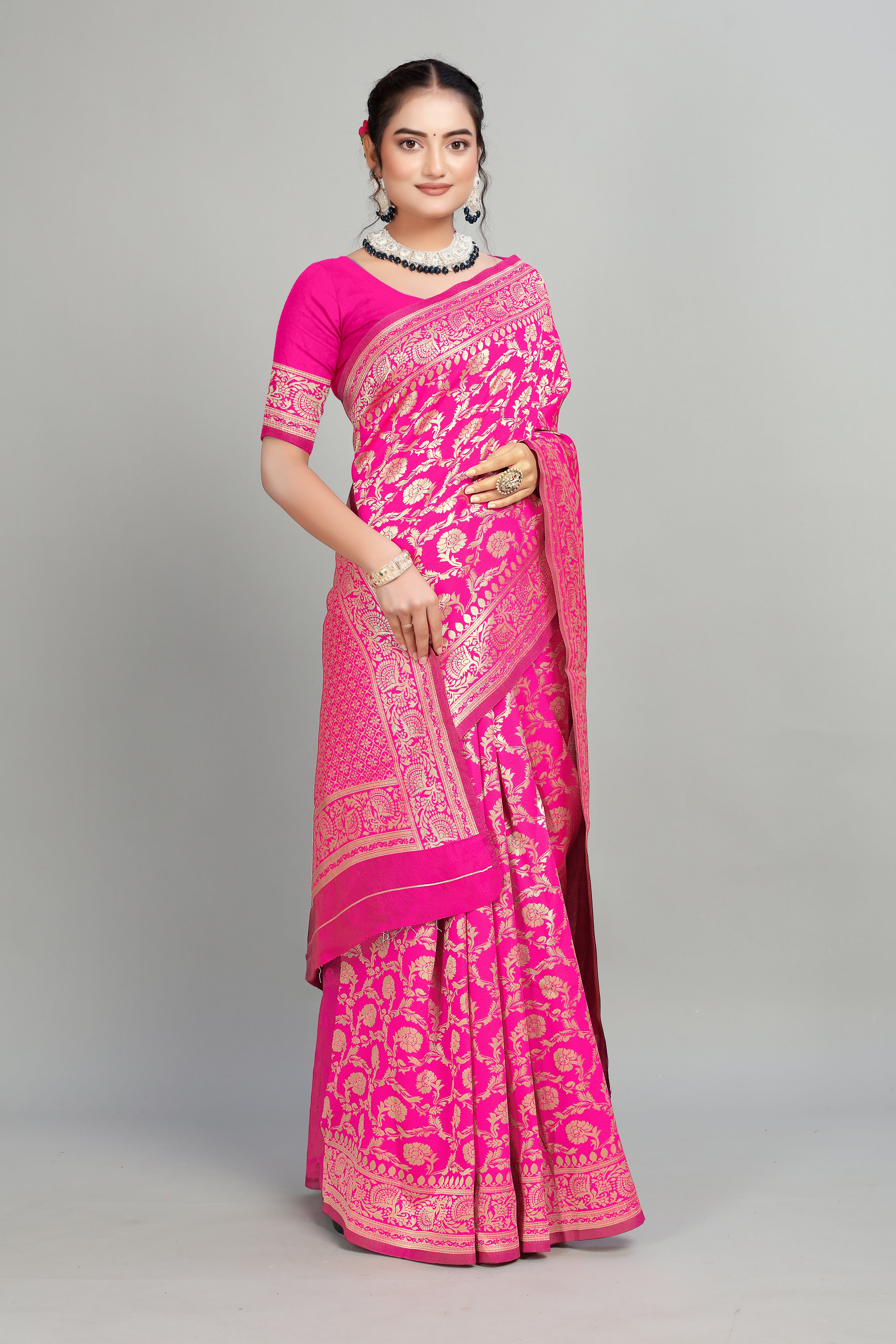 Experience elegance with this soft Silk Blend saree, featuring a beautiful rich pallu and intricate jacquard work throughout. The exclusive blouse complements the saree perfectly with its detailed jacquard border, adding a refined touch to your ensemble. Ideal for special occasions, this saree combines traditional craftsmanship with luxurious fabric for a graceful and sophisticated look.