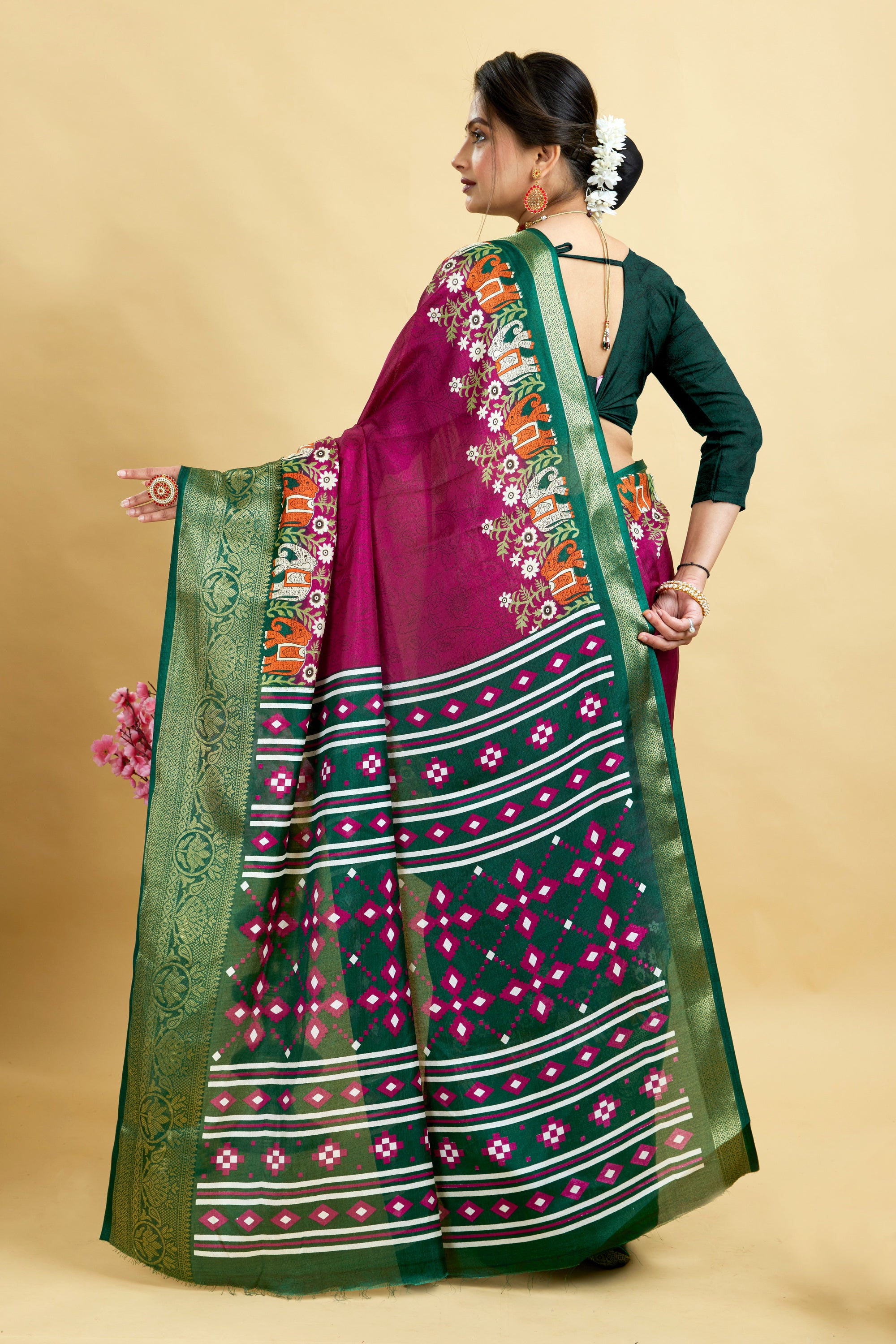 Presenting our enchanting soft Dola cotton saree, perfect for both intimate celebrations and grand Indian weddings. Lightweight and breathable, it feels gentle on the skin while adding charm and elegance to your festivities. Paired with a Jecard Kanjivaram blouse, this saree creates a sophisticated and cohesive look, making it an ideal choice for weddings, special occasions, and festive celebrations.