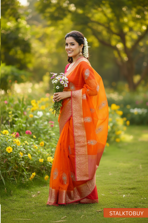 Presenting an exquisite Kanjivaram Organza Jacquard Saree, crafted to add grace and grandeur to your special occasions. Designed with delicate multi-sequence full work that shimmers with every move, this saree is perfect for intimate gatherings as well as traditional Indian weddings.