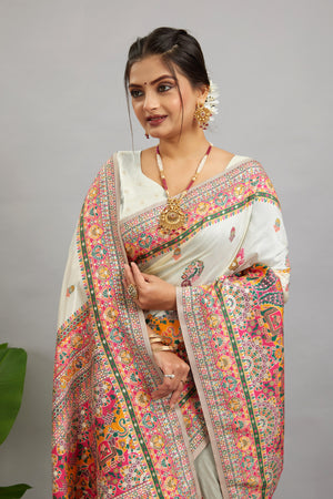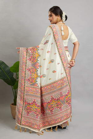 Experience the elegance of the Pure n Soft Rajwadi Pashmina Silk Saree, crafted with intricate Kashmiri thread work on the pallu and adorned with delicate fancy tassels. Its heavy Rajwadi and zari woven border enhances the traditional aesthetic, while the running butti blouse design adds subtle sophistication. This saree combines luxurious texture with timeless craftsmanship, perfect for special occasions where refined style is paramount.