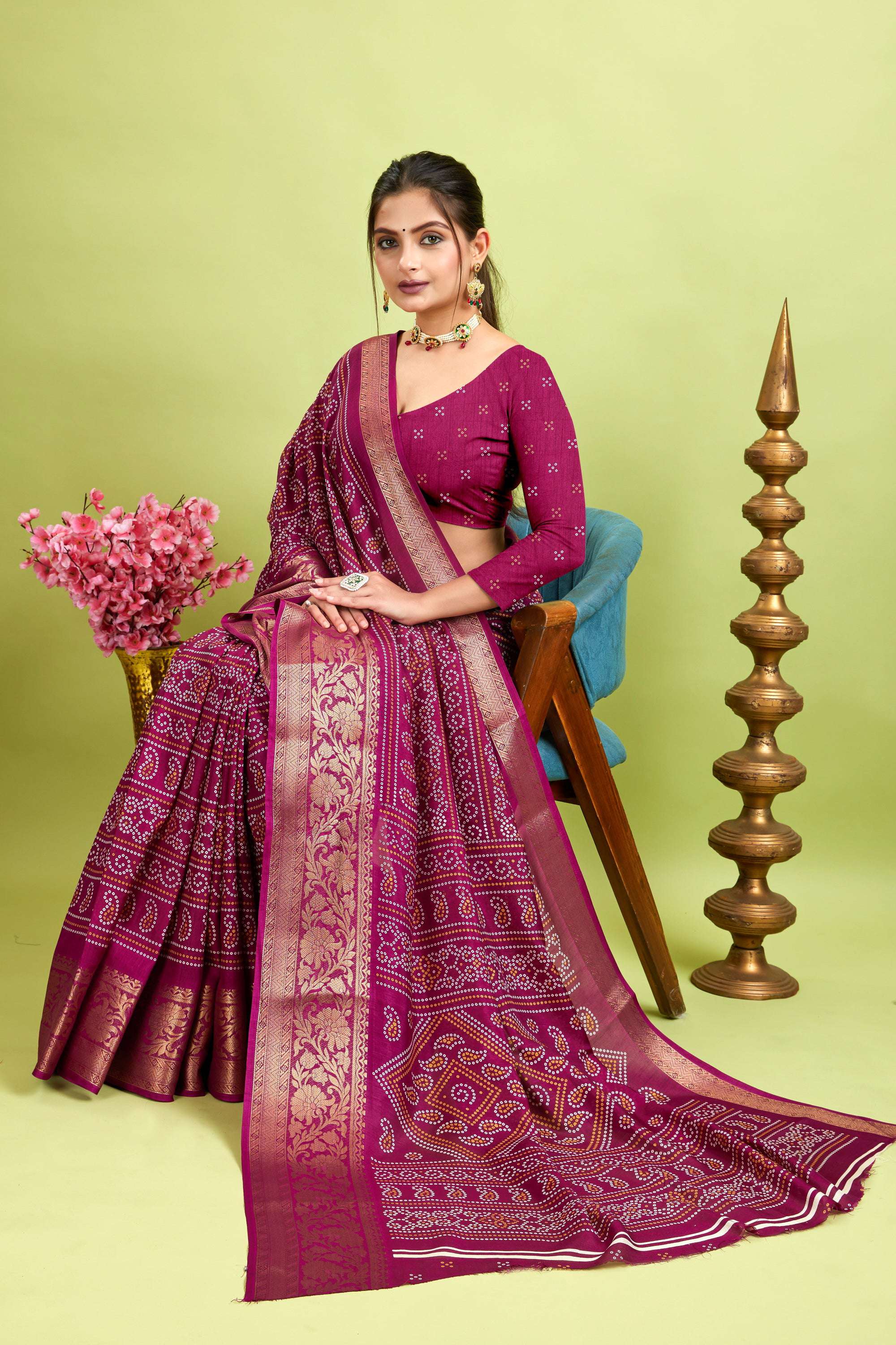Crafted from soft, high-quality Dola cotton, this saree offers a comfortable and breathable fit. Its natural moisture-wicking properties keep you cool and dry all day, making it perfect for both everyday wear and special occasions. Featuring a vibrant Bandhani print and a Kanjivaram-inspired border, this saree combines traditional charm with effortless elegance. Paired with a coordinating Soft Dola Cotton blouse, it provides a complete, stylish ensemble.