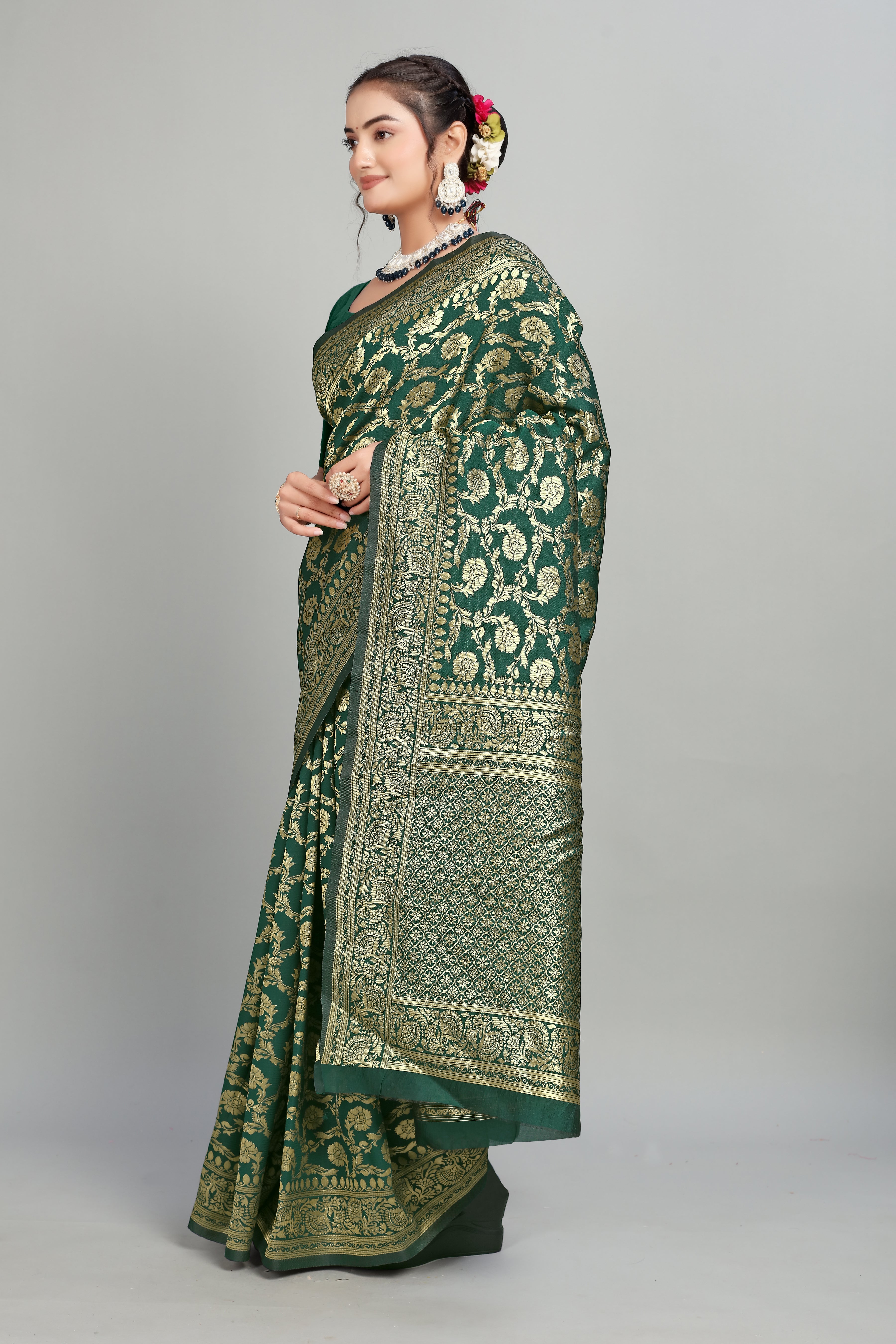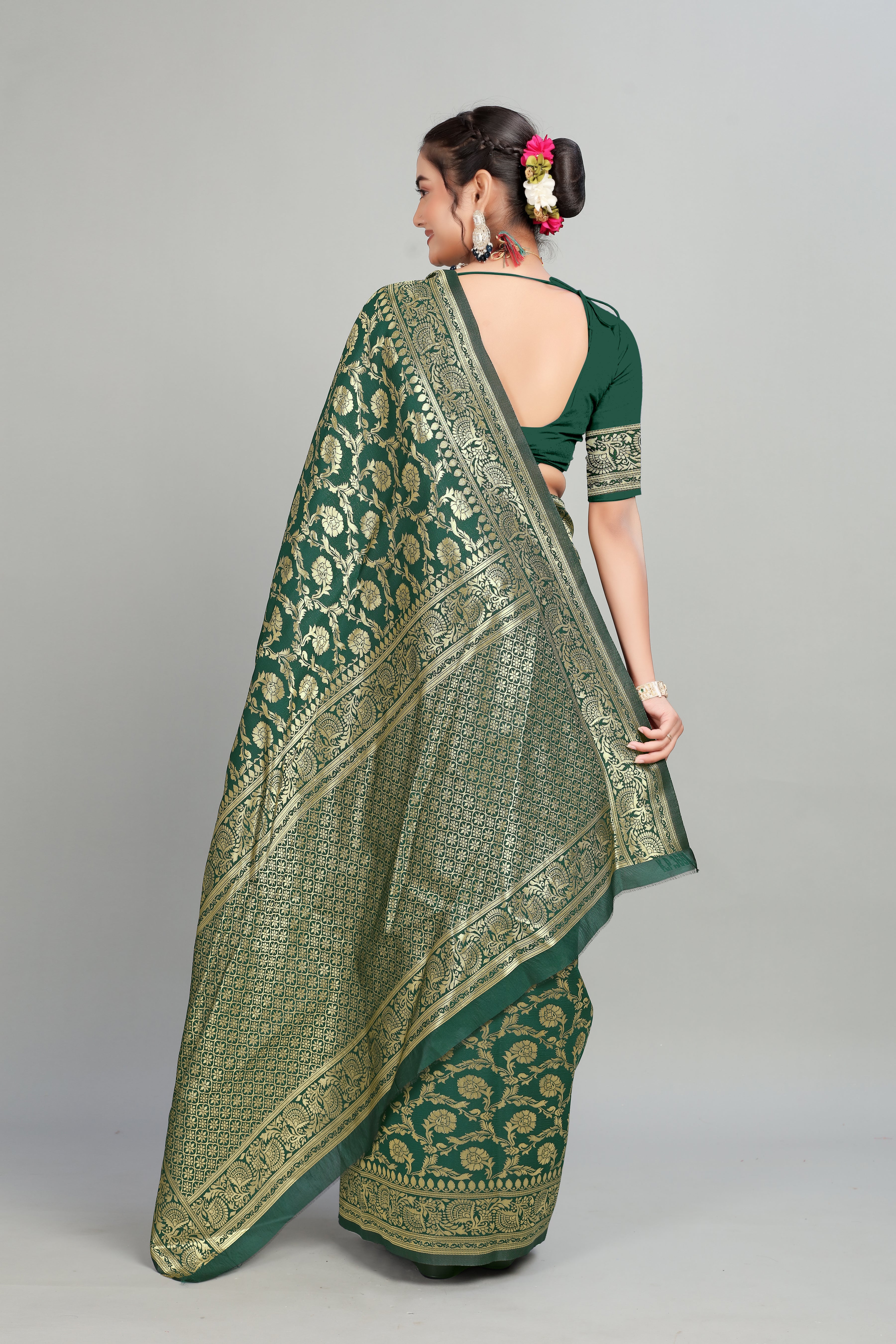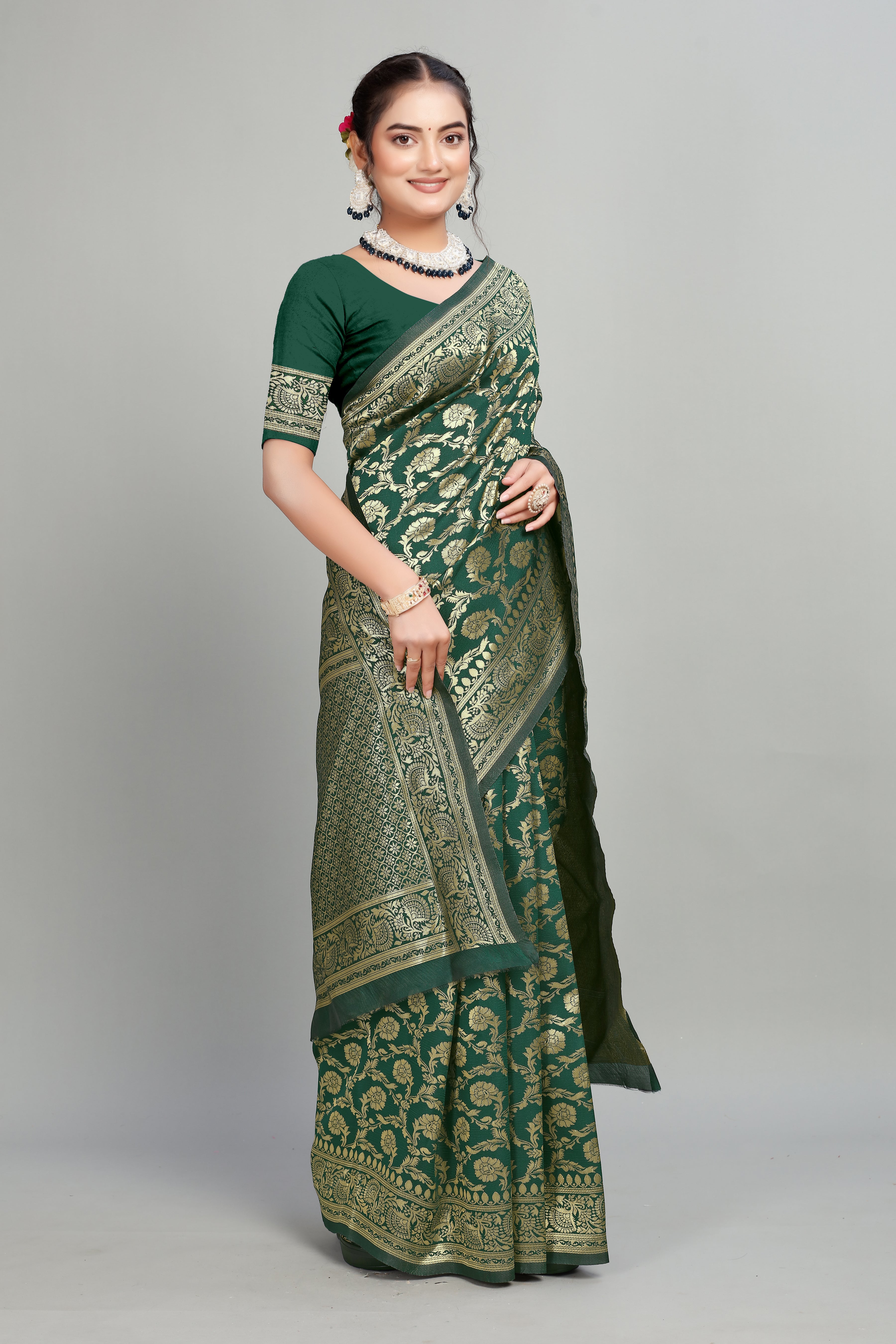 Experience elegance with this soft Silk Blend saree, featuring a beautiful rich pallu and intricate jacquard work throughout. The exclusive blouse complements the saree perfectly with its detailed jacquard border, adding a refined touch to your ensemble. Ideal for special occasions, this saree combines traditional craftsmanship with luxurious fabric for a graceful and sophisticated look.
