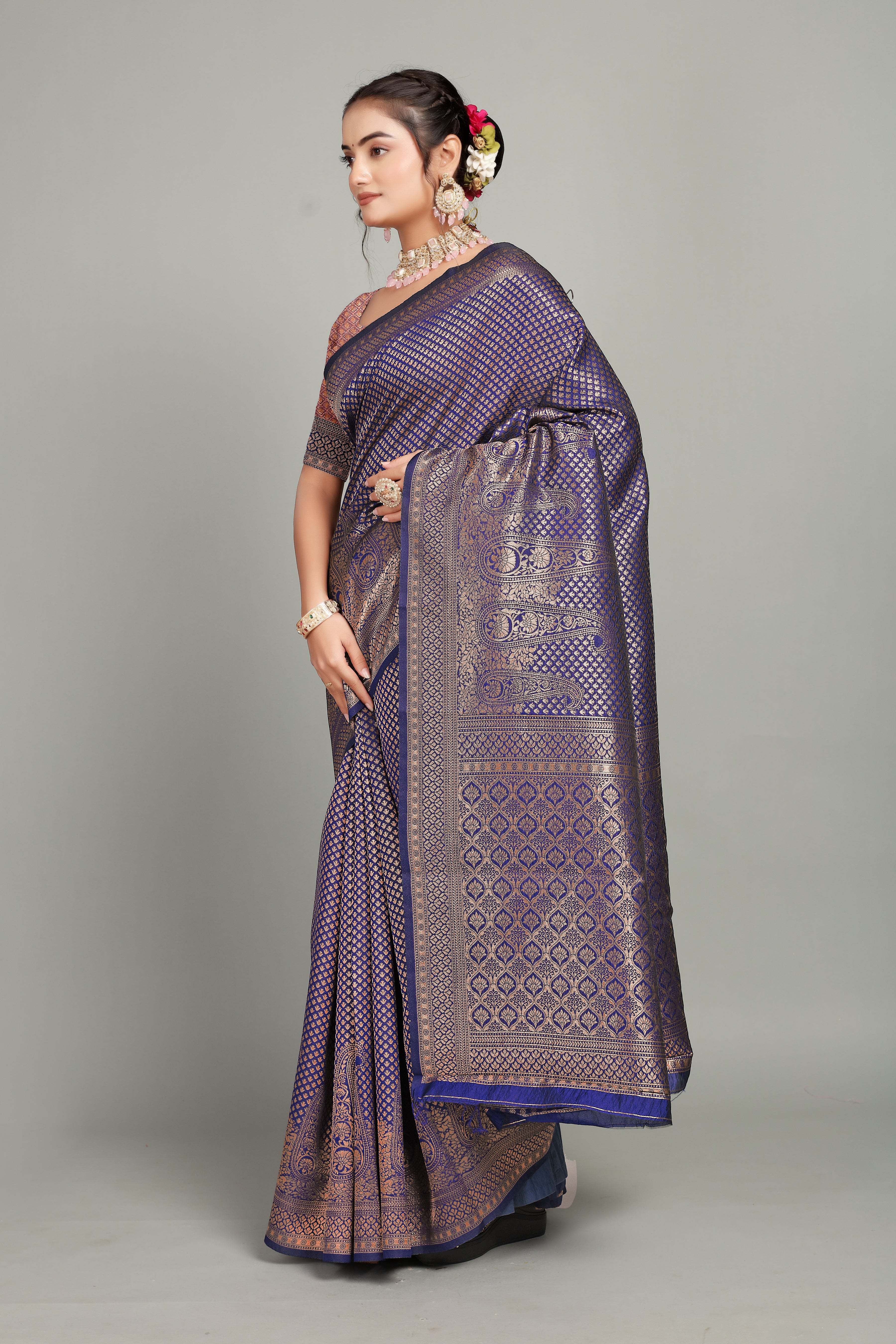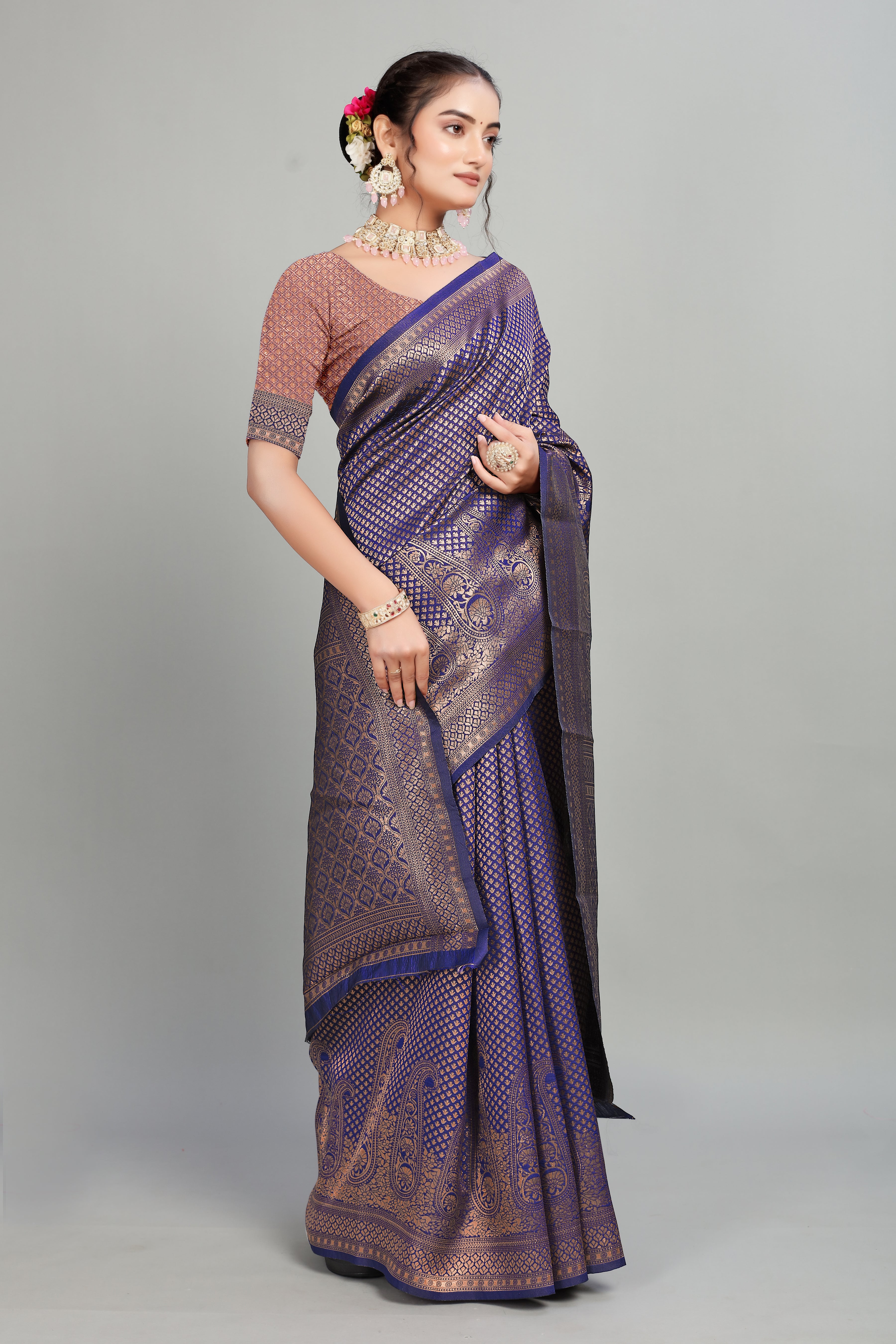 Crafted from soft Silk Blend, this saree features an exquisite rich pallu adorned with intricate jacquard work throughout, enhancing its opulent appeal. The blouse complements the saree with an exclusive jacquard border, adding a refined touch to the ensemble. Ideal for special occasions, this combination offers both elegance and comfort, reflecting expert craftsmanship in every detail.
