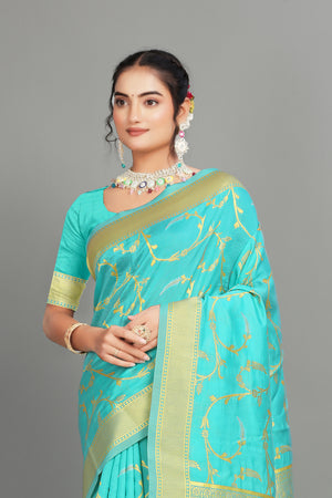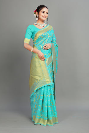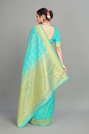 Crafted from soft Silk Blend, this saree features an exquisite rich pallu adorned with intricate jacquard work throughout, lending it an elegant and sophisticated appeal. Complementing the saree, the blouse is designed with an exclusive jacquard border that enhances the overall luxurious look. Perfect for special occasions, this ensemble offers a refined texture and timeless style.