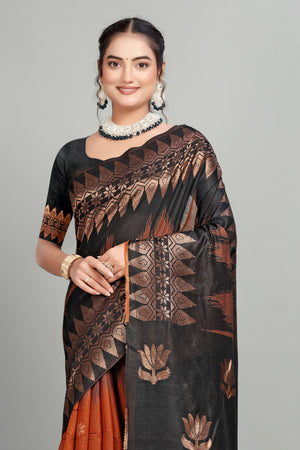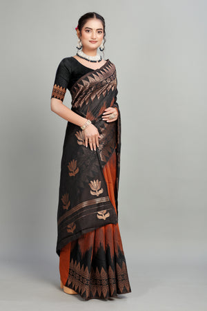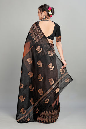 This elegant cotton silk saree features a rich pallu adorned with intricate jacquard work, enhancing its timeless charm. The exquisite jacquard detailing extends throughout the saree, lending it a sophisticated and luxurious appeal. Paired with an exclusive blouse featuring a matching jacquard border, this saree is perfect for occasions where refined style meets traditional craftsmanship.