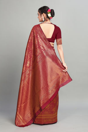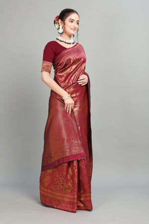 Experience elegance with this soft Silk Blend saree, featuring a beautiful rich pallu and intricate jacquard work throughout. The saree’s exquisite craftsmanship is complemented by an exclusive jacquard border blouse, adding a refined touch to your traditional attire. Ideal for special occasions, this saree combines comfort with sophisticated design for a timeless look.
