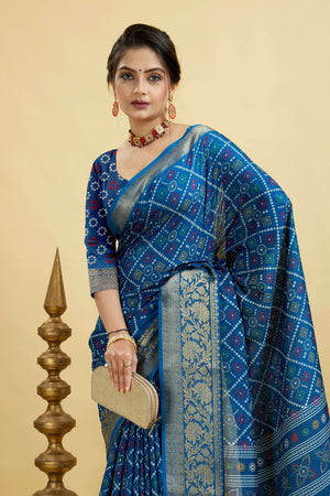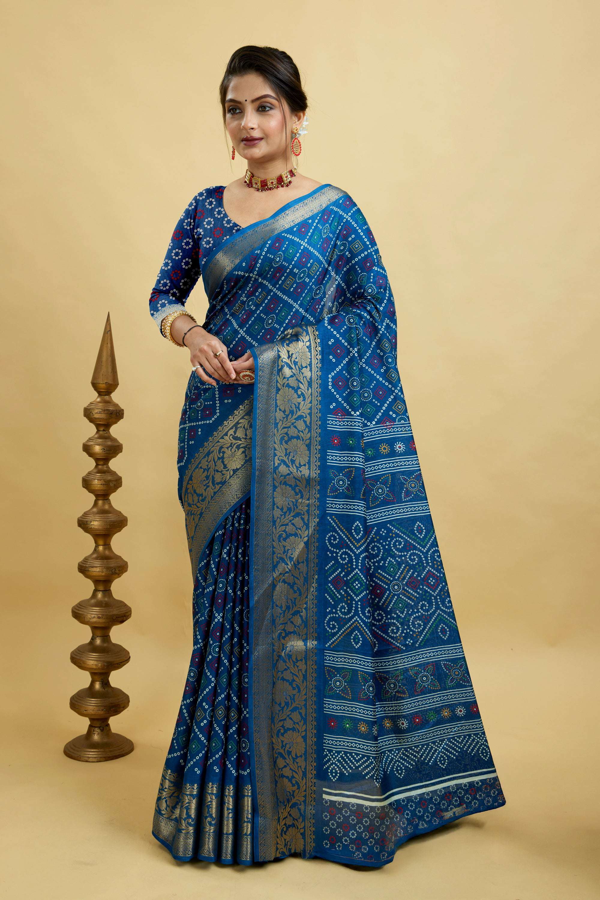 Blue Bandhani Print Soft Dola Cotton Kanjivaram Saree