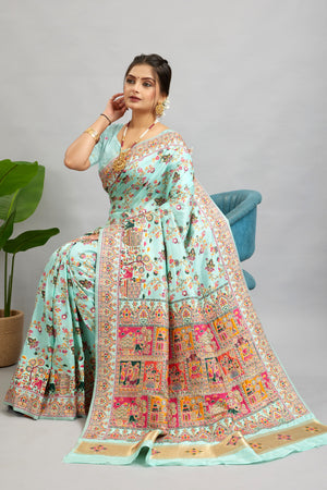 Experience the elegance of the Minakari Banarasi Saree, featuring intricate Kashmiri thread work on a richly woven pallu. This saree is adorned with a heavy Rajwadi N Zari weaving border, enhancing its regal appeal. Complemented by a running butti blouse, it offers a sophisticated ensemble perfect for special occasions and traditional celebrations. Crafted to impress, it blends fine craftsmanship with luxurious silk softness, embodying timeless heritage and style.