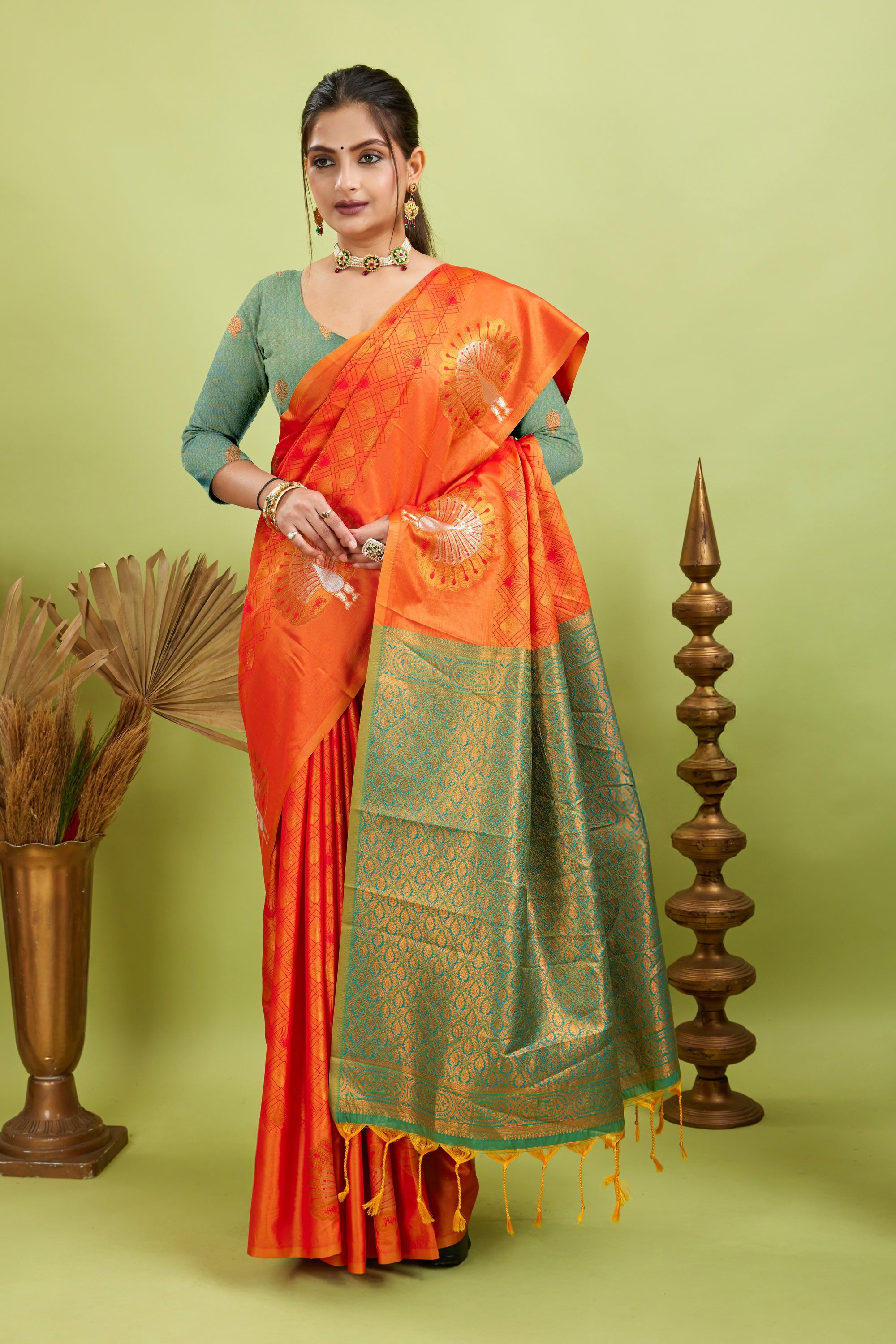 This exquisite two-tone Banarasi Handloom Silk saree, available in eight captivating colors, features a fabric that subtly shifts shades under light, enhancing its luxurious appeal. Adorned with refined copper zari floral motifs and complemented by an intricately woven pallu and border, it seamlessly blends traditional craftsmanship with timeless elegance. Perfect for those who appreciate the artistry of heritage weaving combined with sophisticated design.