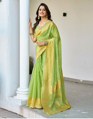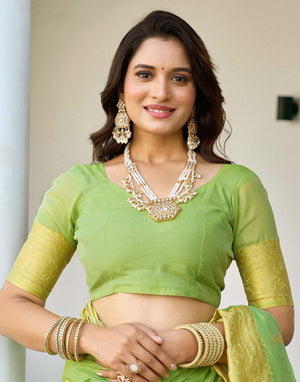 Experience the elegance of the new Cotton Silk fabric, designed for comfort and style. This fabric features a smooth, charming texture that feels gentle against the skin, making it perfect for daily wear. Complemented by a richly woven blouse, it offers a refined look with intricate weaving that adds depth and sophistication to your outfit. Ideal for those who appreciate quality craftsmanship combined with a soft touch, this ensemble delivers both visual appeal and lasting comfort.