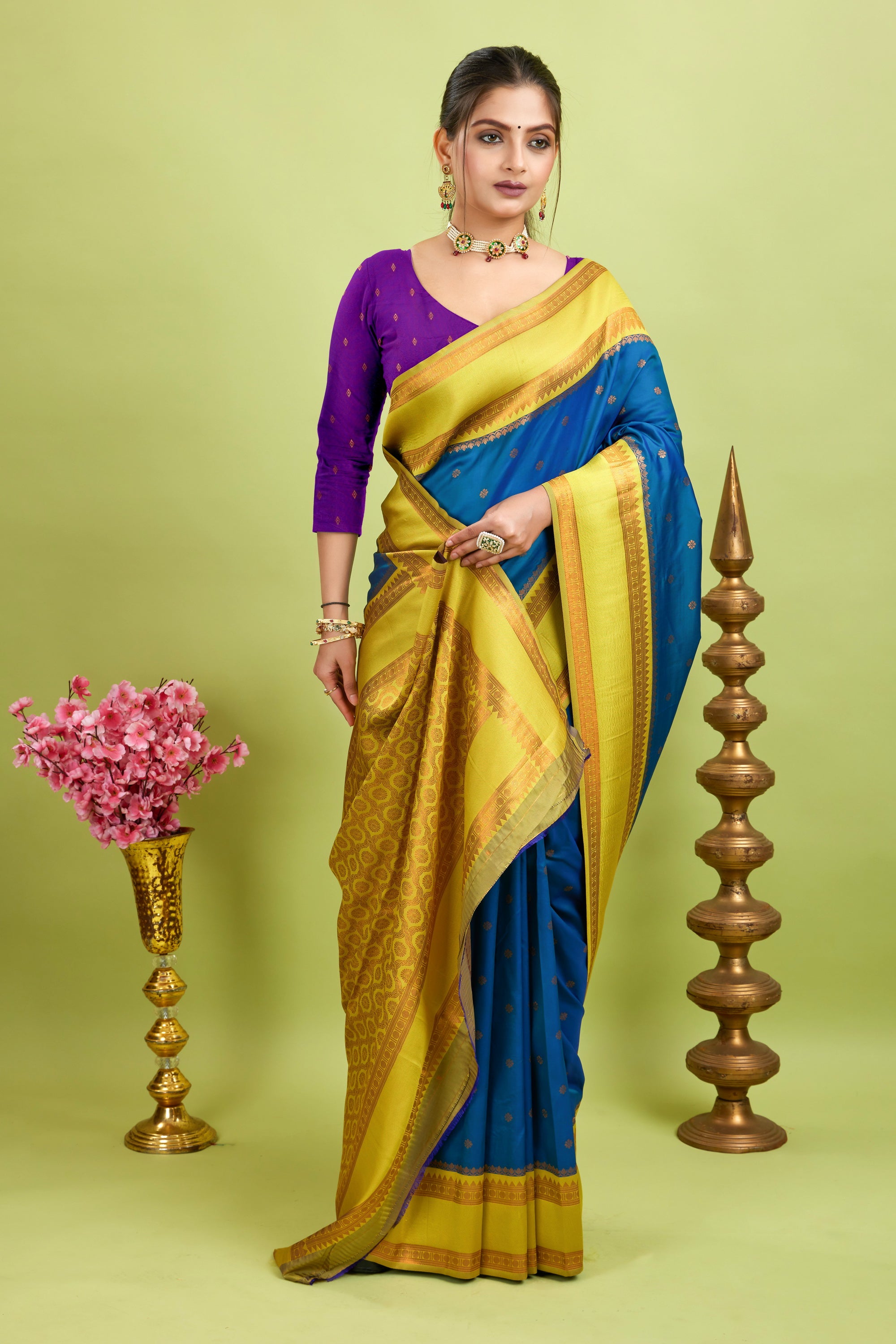 Silk Blend Sarees – Premium two-tone fabric featuring Narayan border and dual zari motifs all over the body. This saree showcases a rich, woven contrast zari pallu and a unique contrast zari border, paired perfectly with a matching contrast blouse.