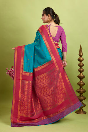 Silk Blend Sarees – Premium two-tone fabric featuring Narayan border and dual zari motifs all over the body. This saree showcases a rich, woven contrast zari pallu and a unique contrast zari border, paired perfectly with a matching contrast blouse.