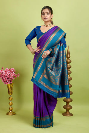 Silk Blend Sarees – Premium two-tone fabric featuring Narayan border and dual zari motifs all over the body. This saree showcases a rich, woven contrast zari pallu and a unique contrast zari border, paired perfectly with a matching contrast blouse.