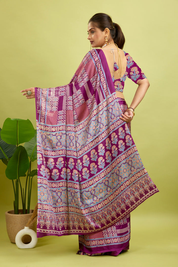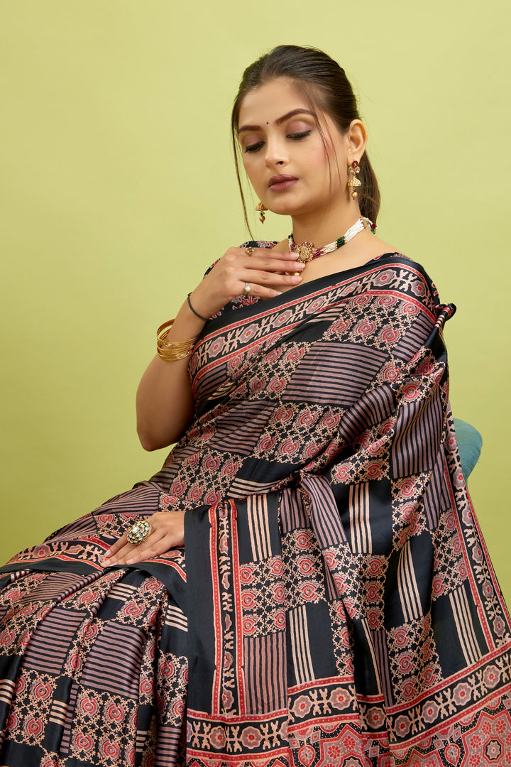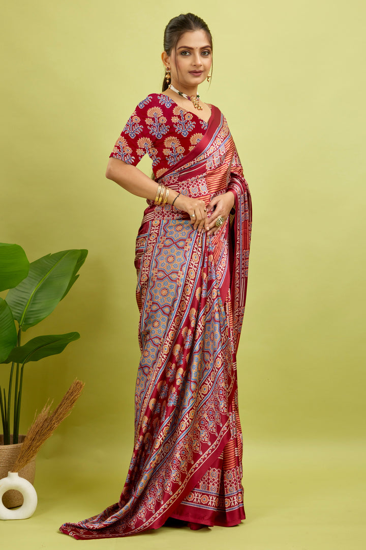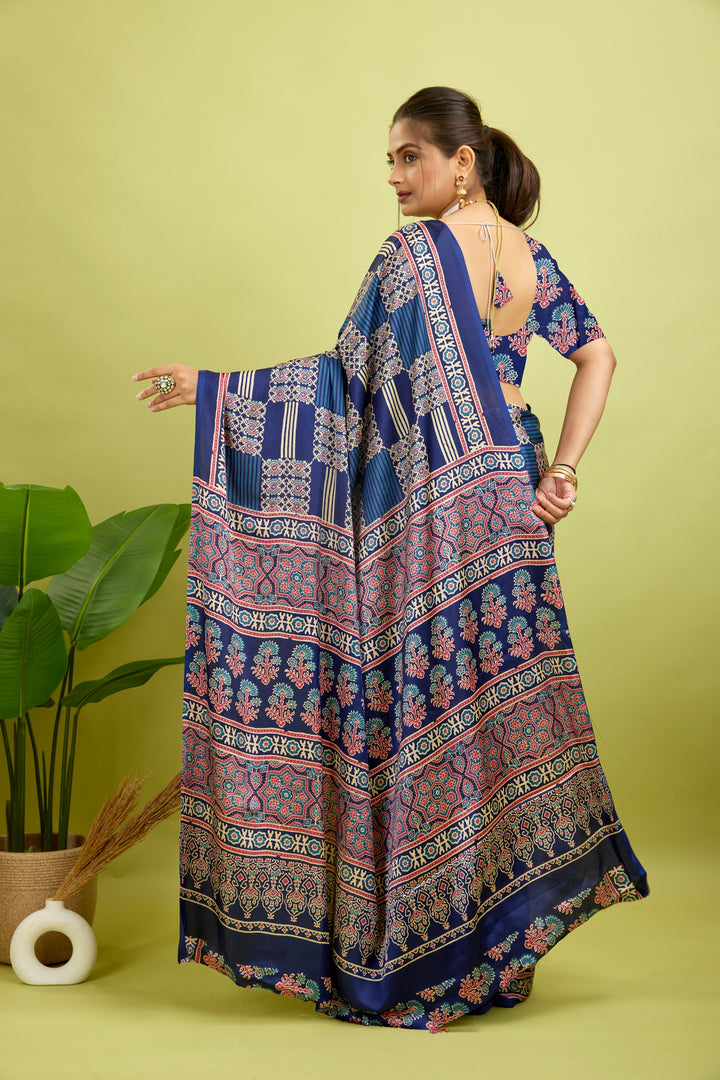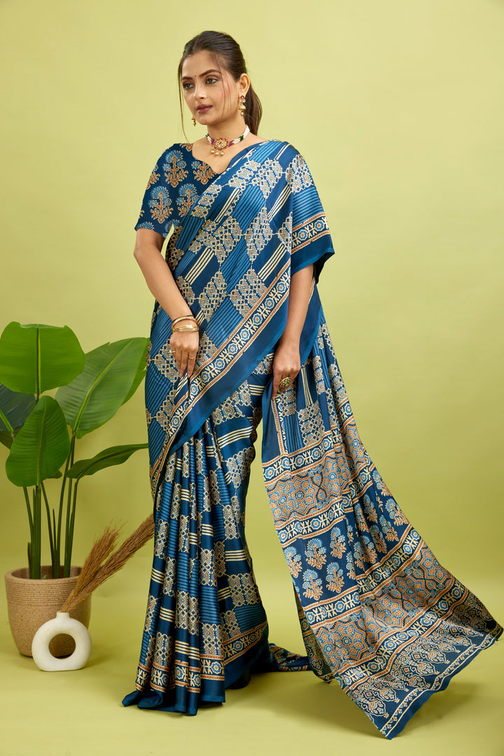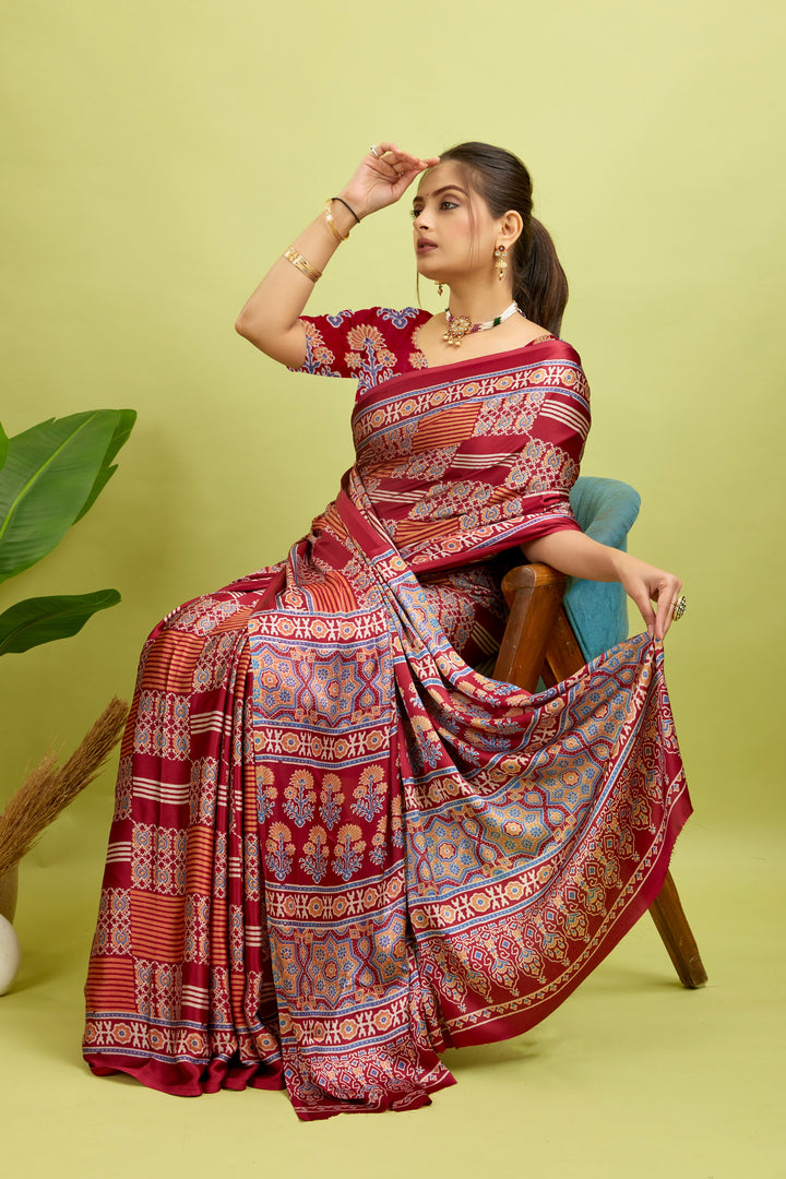 Experience the elegance of the original Ajrakh semi gaji saree, showcasing traditional craftsmanship with distinctive Ajrakh and Bandhej patterns. This saree combines rich textures and natural dye techniques, creating a timeless piece that reflects authentic artistry. Perfect for special occasions, it offers both comfort and style rooted in cultural heritage.