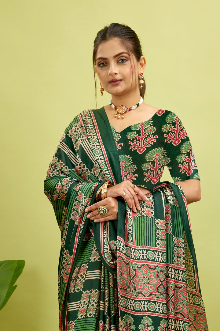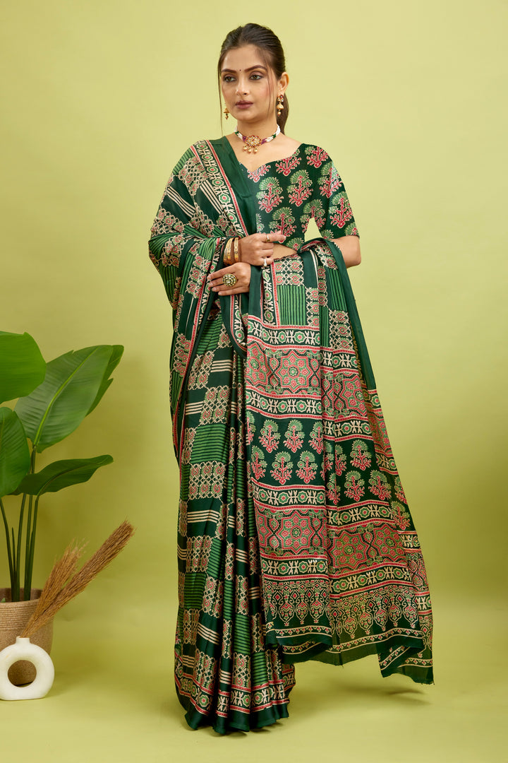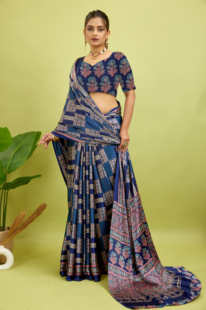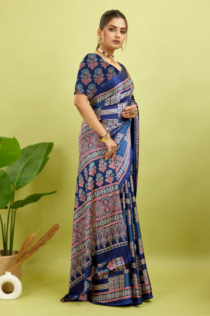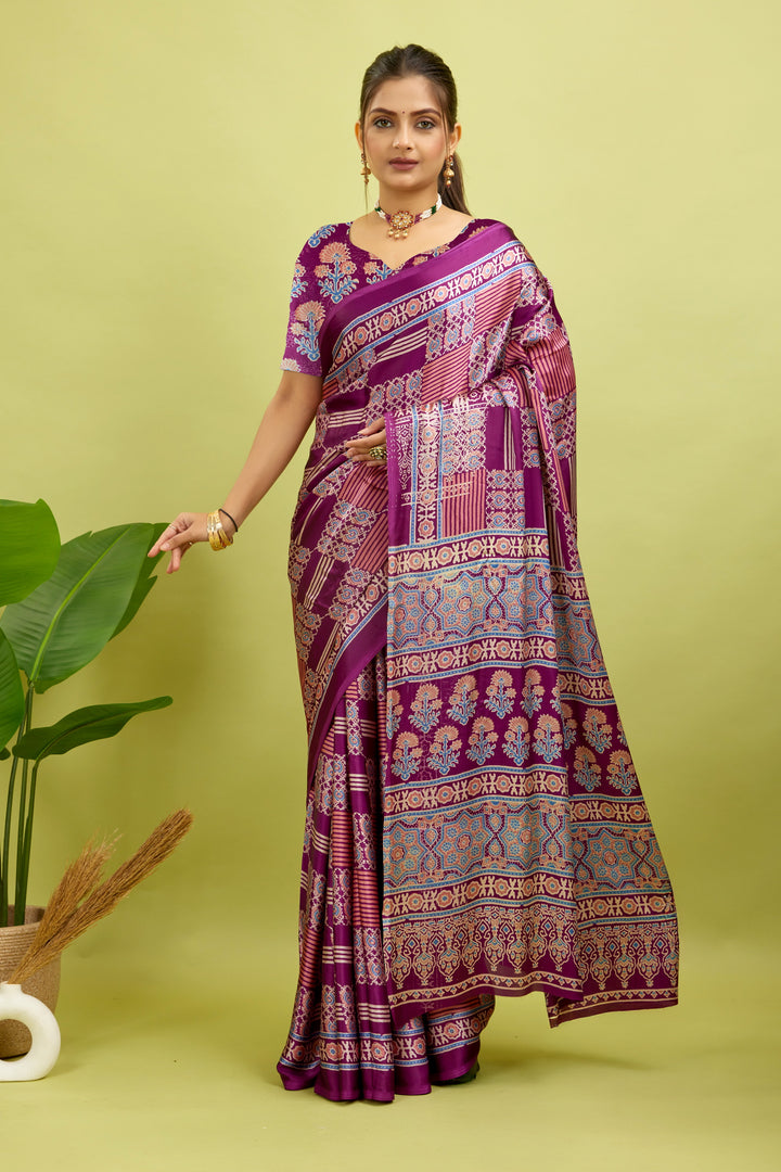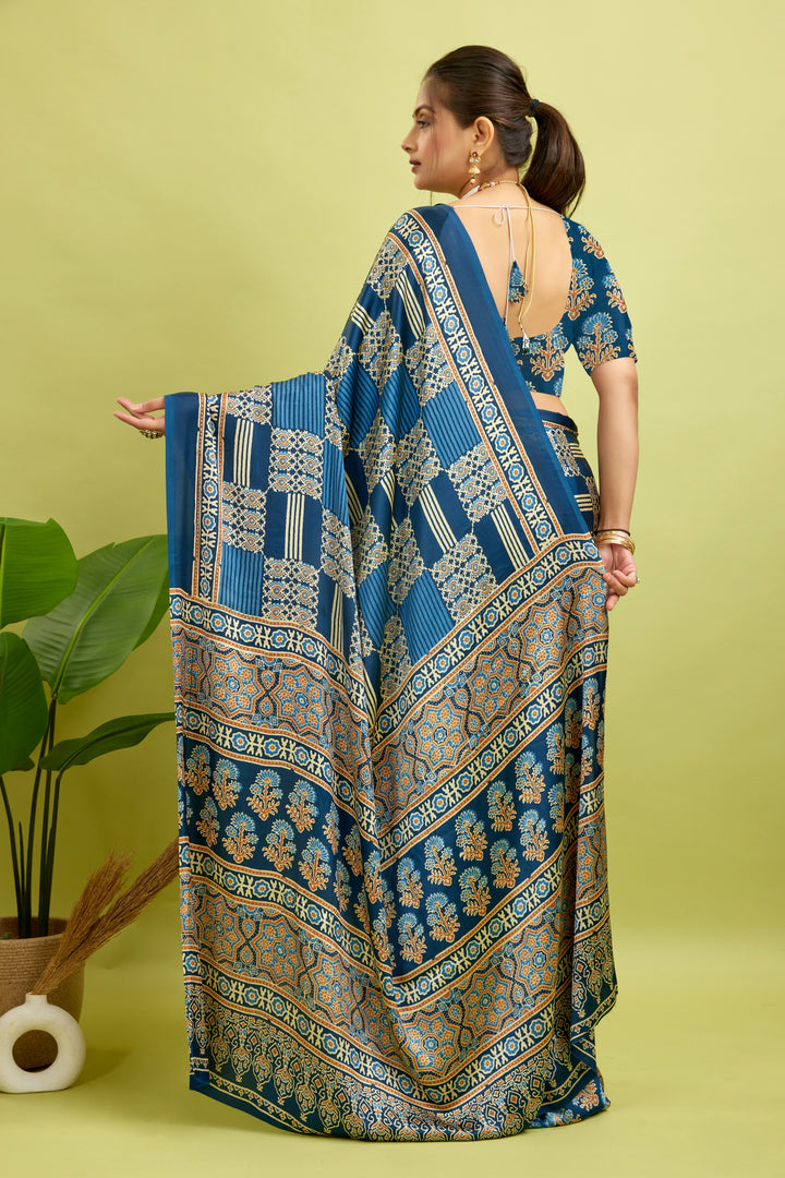 Experience the elegance of the original Ajrakh semi gaji saree, showcasing traditional craftsmanship with distinctive Ajrakh and Bandhej patterns. This saree combines rich textures and natural dye techniques, creating a timeless piece that reflects authentic artistry. Perfect for special occasions, it offers both comfort and style rooted in cultural heritage.