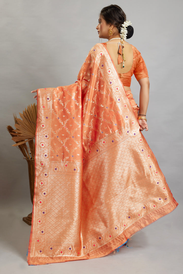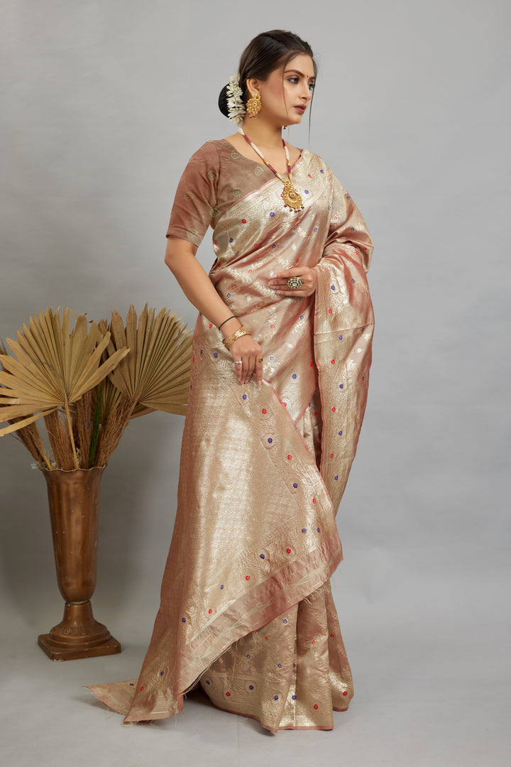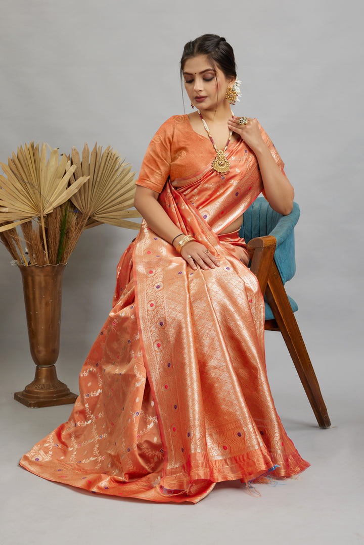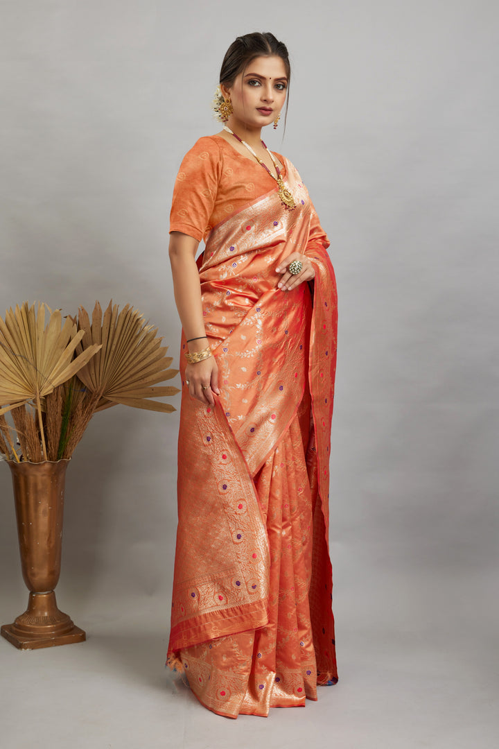 This Banarasi Silk saree features an exquisite all-over floral and Mina design, showcasing intricate zari weaving that celebrates its rich heritage. Its unique border perfectly complements a heavy, ornate pallu adorned with fine zari work, making it an ideal choice for special occasions where traditional elegance is desired. Crafted from soft, pure silk, this saree combines comfort with grandeur, offering a sophisticated and timeless piece.