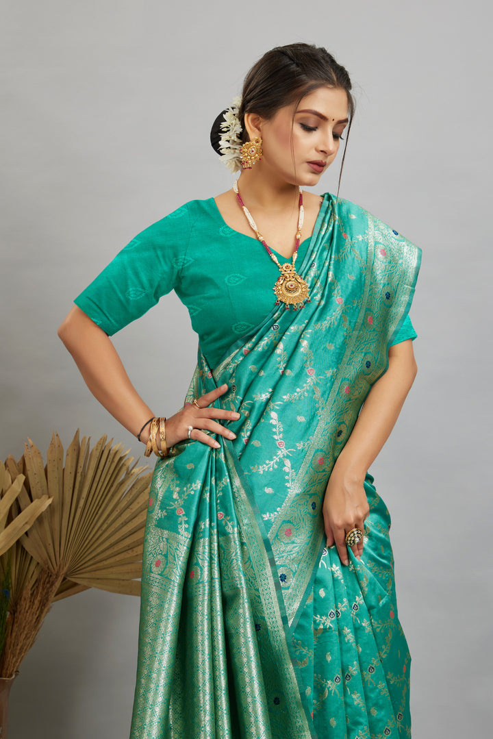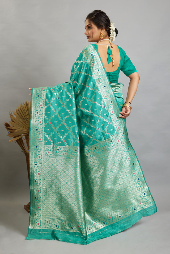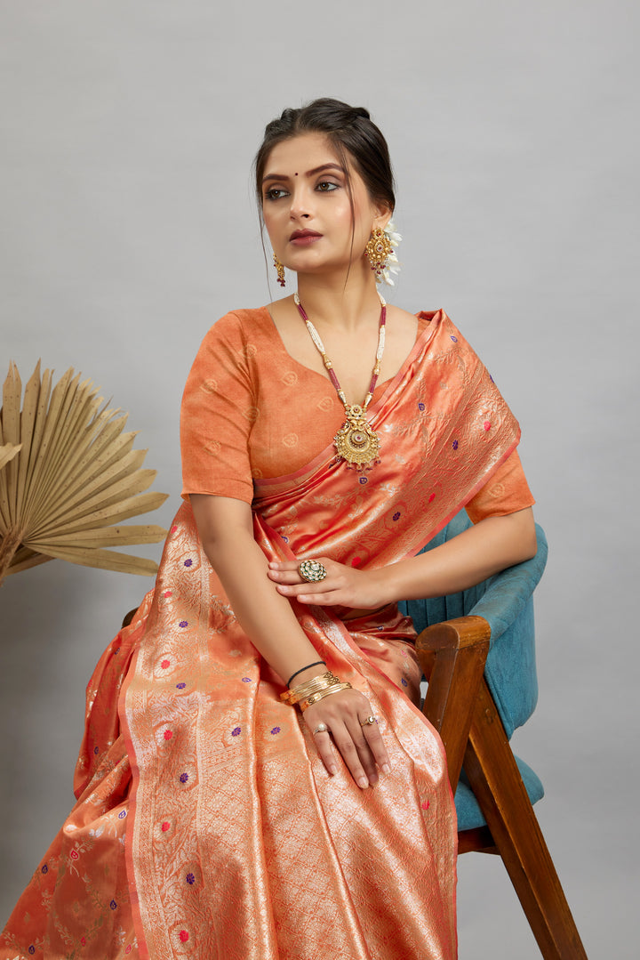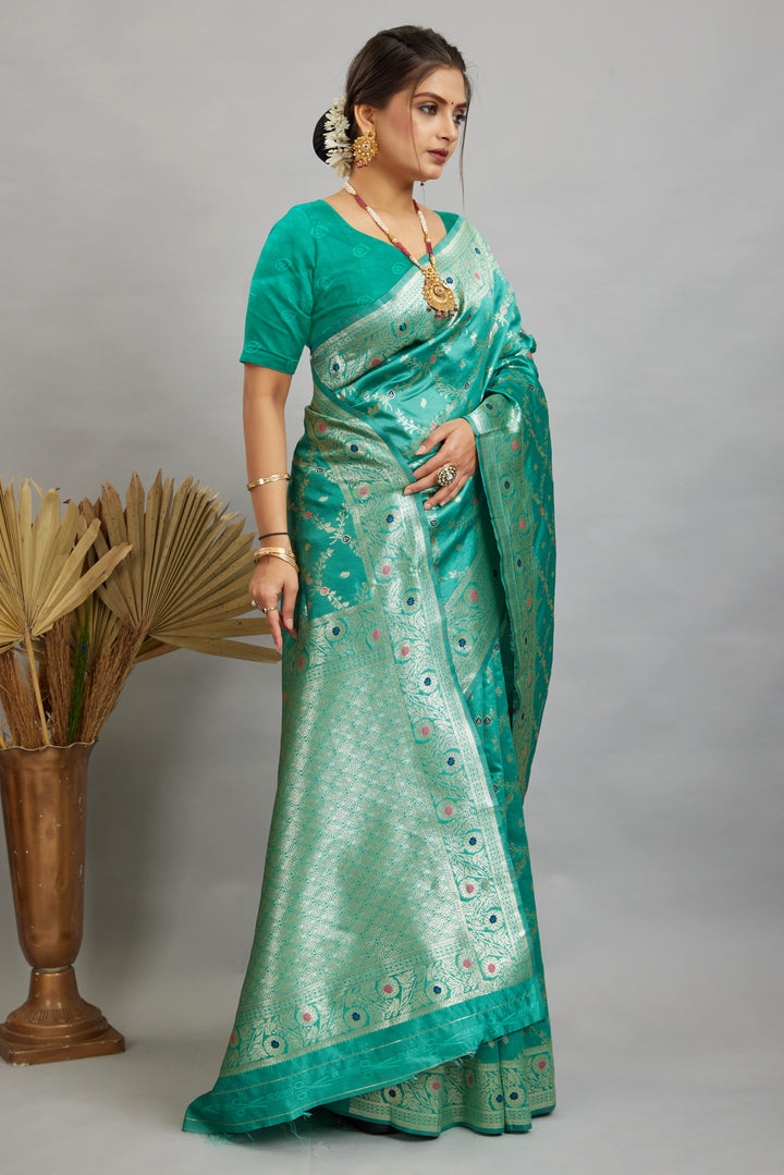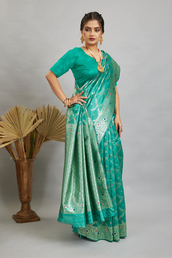 This Banarasi Silk saree features an exquisite all-over floral and Mina design, showcasing intricate zari weaving that celebrates its rich heritage. Its unique border perfectly complements a heavy, ornate pallu adorned with fine zari work, making it an ideal choice for special occasions where traditional elegance is desired. Crafted from soft, pure silk, this saree combines comfort with grandeur, offering a sophisticated and timeless piece.