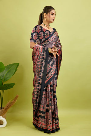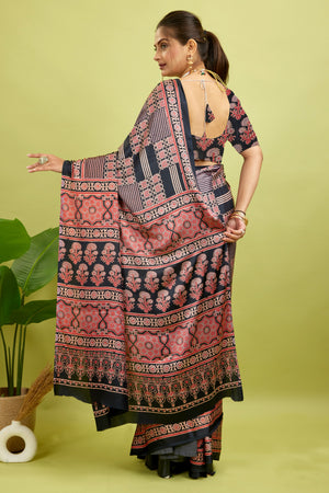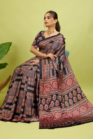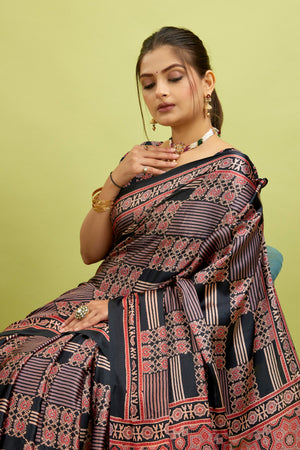 Experience the elegance of the original Ajrakh semi gaji saree, showcasing traditional craftsmanship with distinctive Ajrakh and Bandhej patterns. This saree combines rich textures and natural dye techniques, creating a timeless piece that reflects authentic artistry. Perfect for special occasions, it offers both comfort and style rooted in cultural heritage.