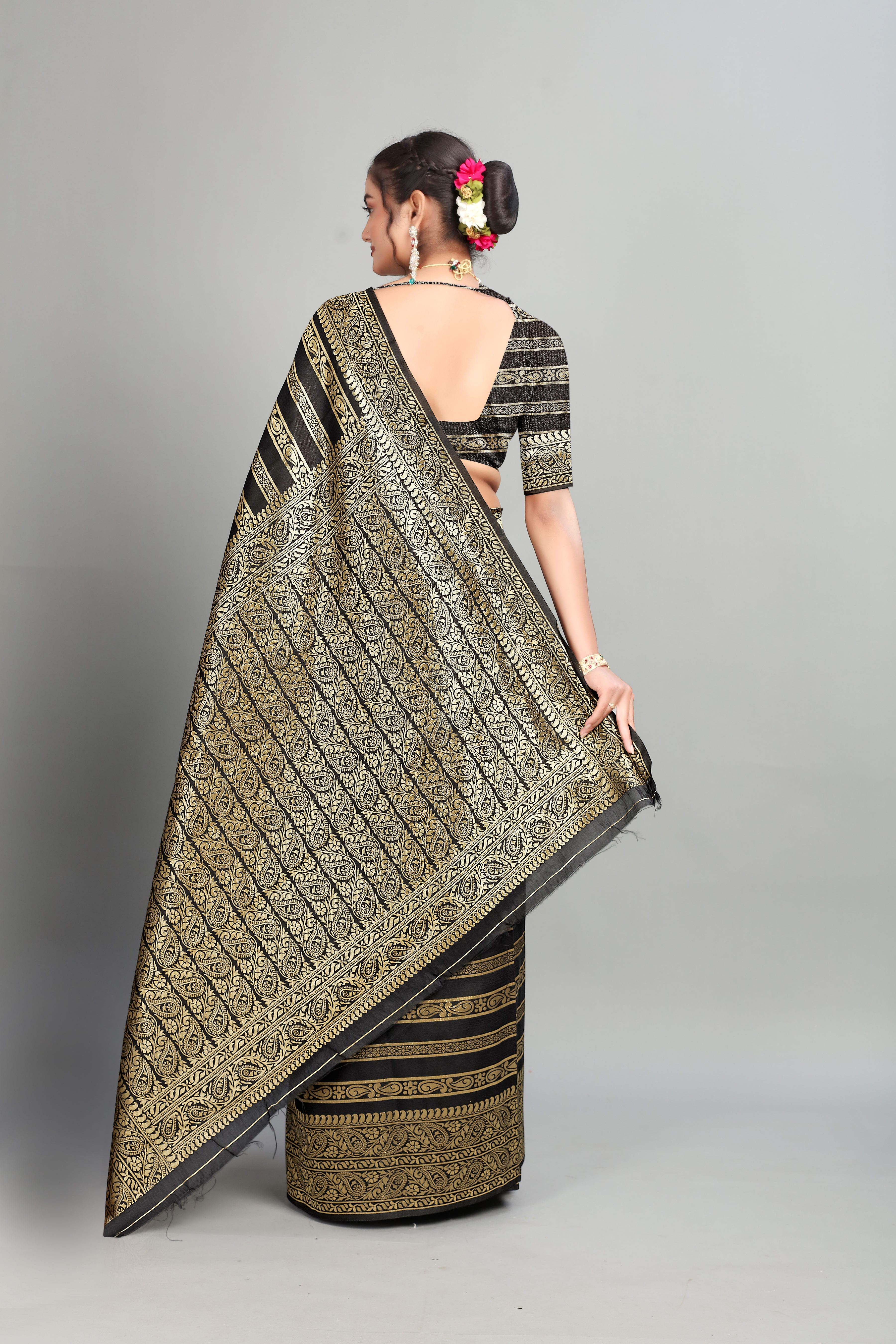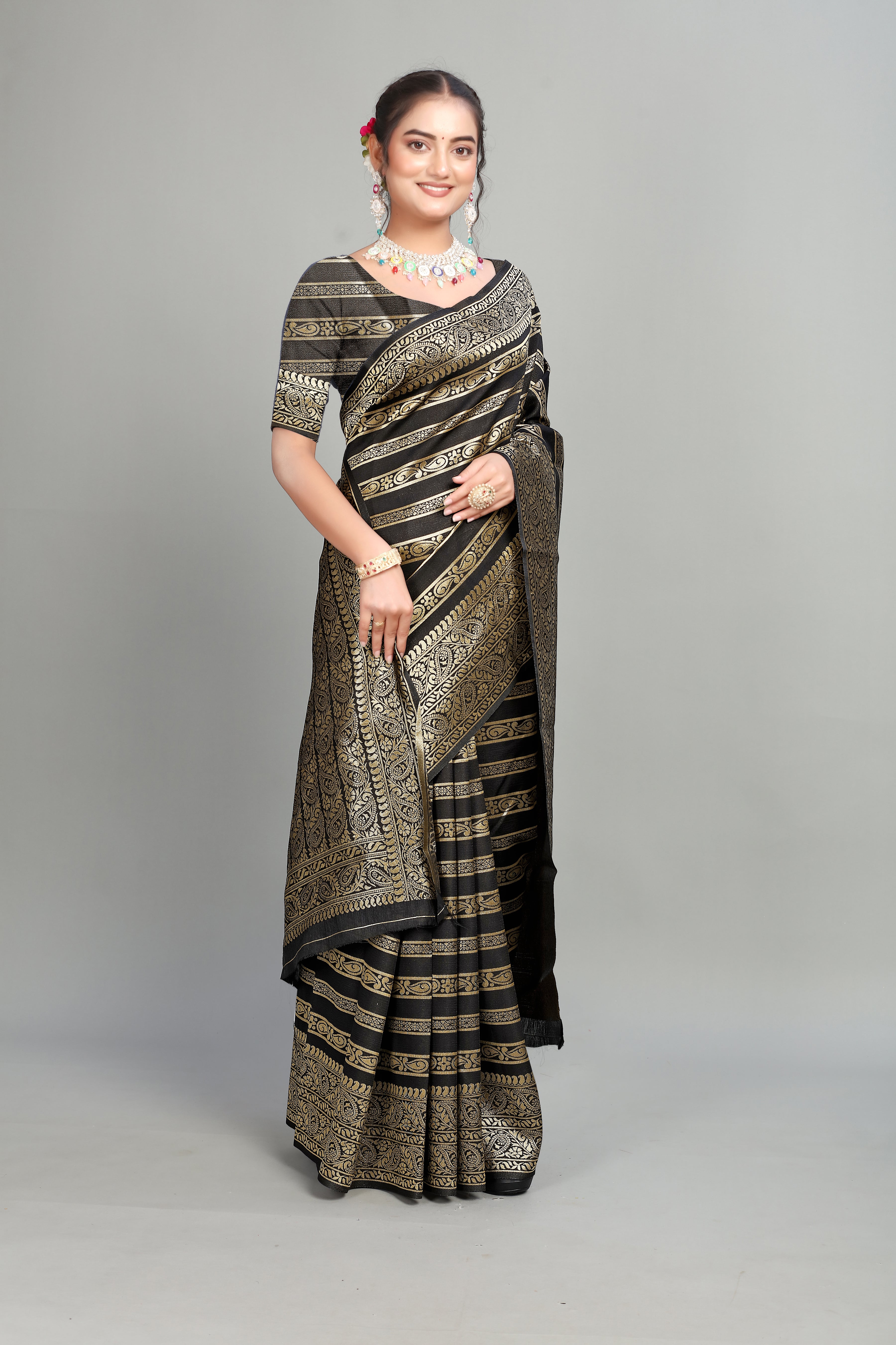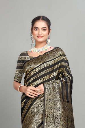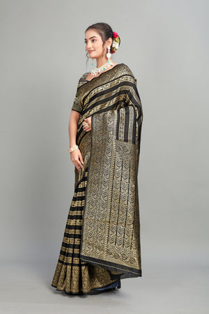 Black Soft Lichi Silk Golden Striped Silk Saree