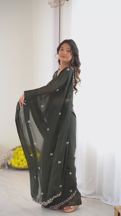 Bottle Green Embroidered Georgette Lace Saree