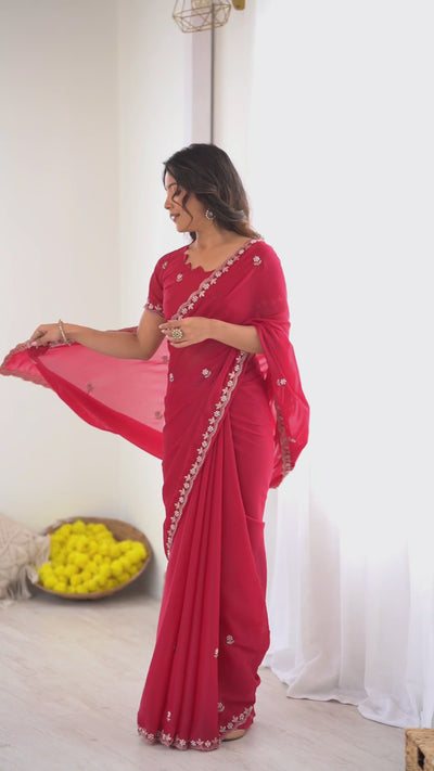 Add a touch of refined elegance to your ethnic collection with this Star Georgette Saree, crafted to offer a graceful drape and subtle shimmer. The saree features delicate embroidery and moti work, beautifully highlighted with a mirror-work border that enhances its overall appeal. Its solid georgette base keeps the look timeless while allowing the intricate detailing to stand out.