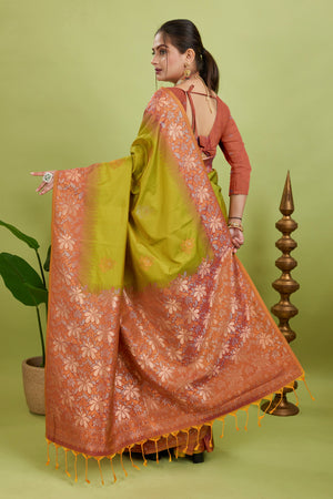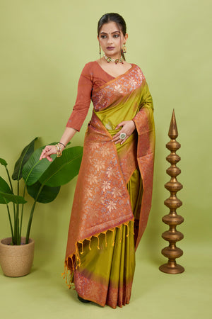 This exquisite two-tone Banarasi handloom silk saree is offered in eight stunning colors, each revealing subtle shade variations under different lighting. Featuring finely woven copper zari floral motifs, along with a meticulously crafted pallu and border, it harmonizes traditional artistry with luxurious elegance, making it an exceptional choice for refined celebrations.