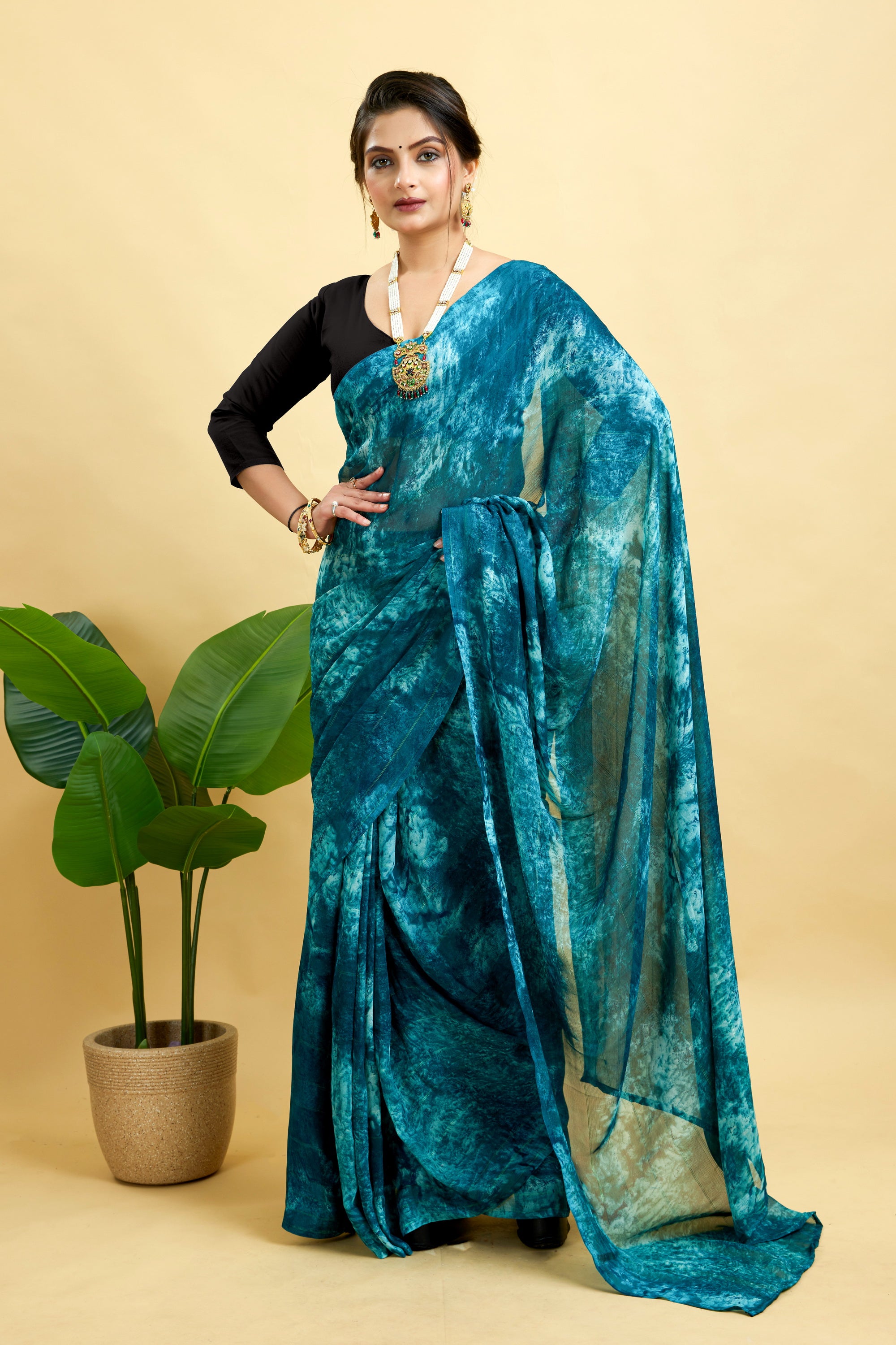 Elevate your style effortlessly with this exquisite marble-dyed saree, crafted from premium Rangoli silk for a luxurious and comfortable drape. Featuring intricate detailing and a graceful design, it is ready to wear in just 1 minute. The coordinating blouse, made from rich Bangalori satin, perfectly complements the saree, creating a sophisticated and elegant ensemble. Ideal for formal occasions, this saree combines style, comfort, and convenience seamlessly.
