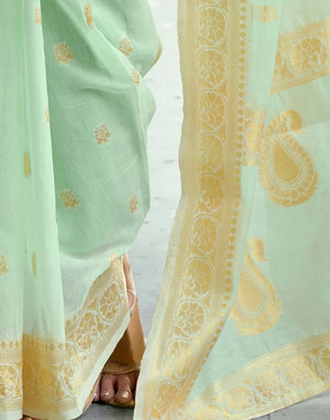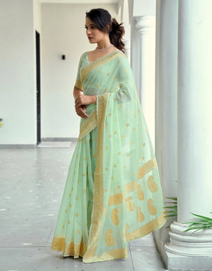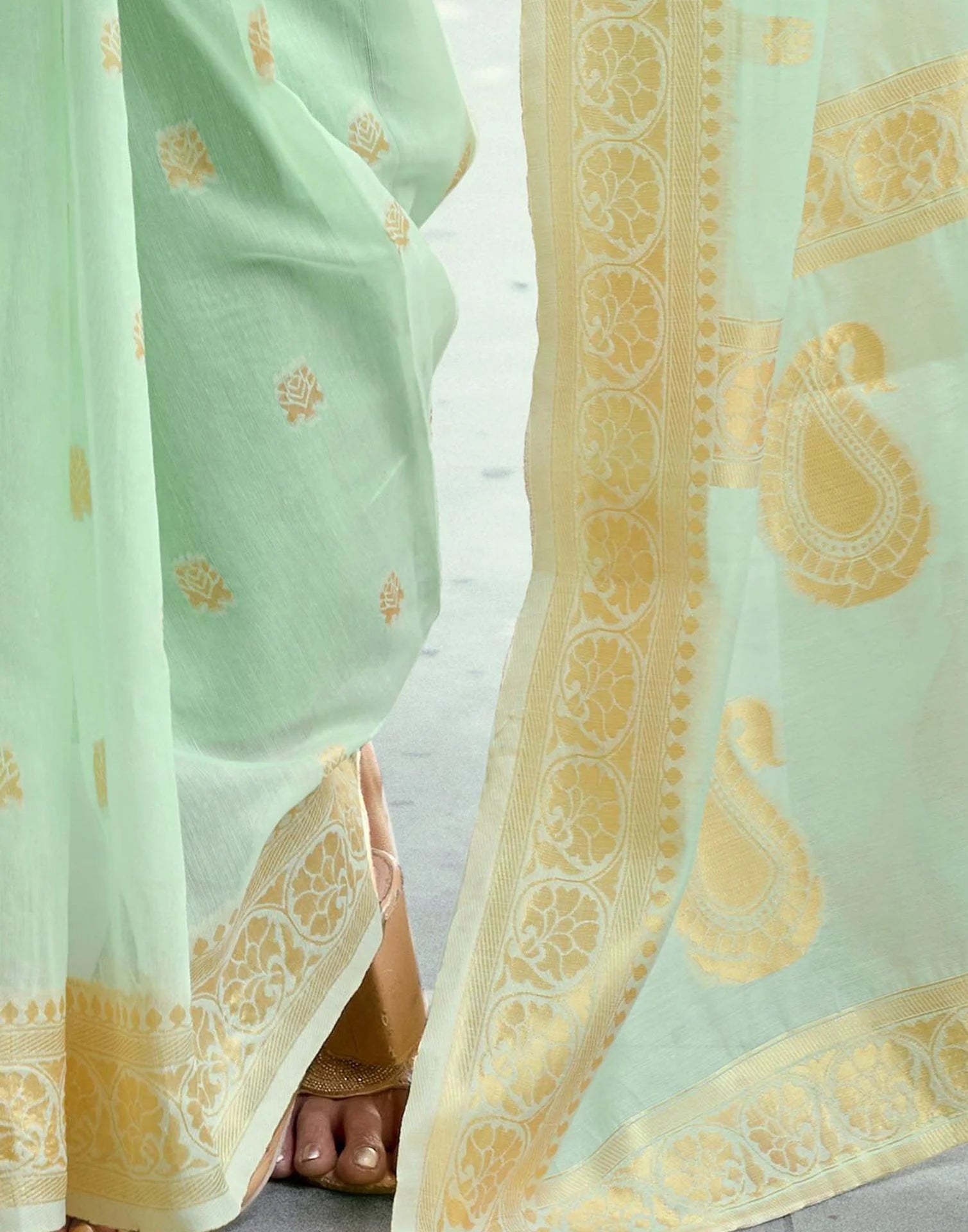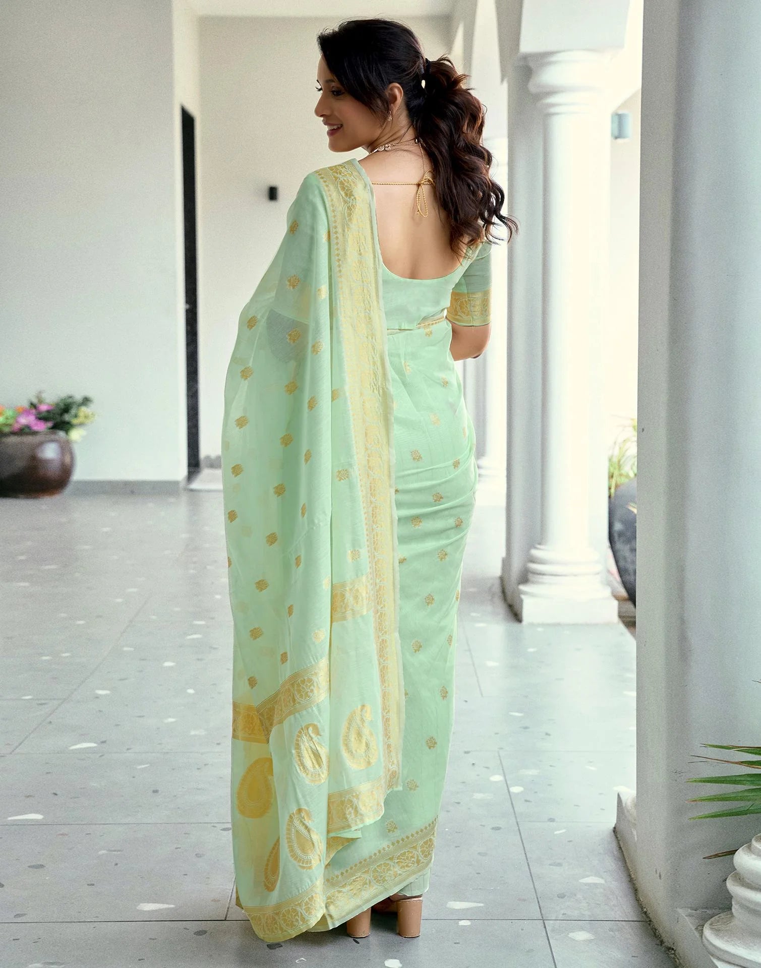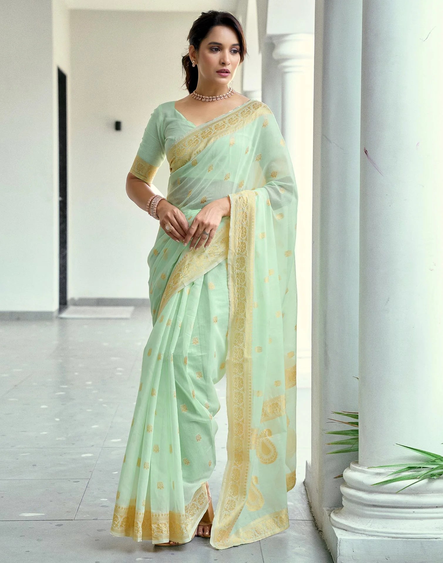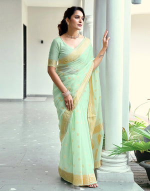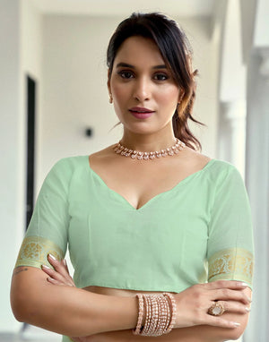 Experience the elegance of the new Cotton Silk fabric, designed for comfort and style. This fabric features a smooth, charming texture that feels gentle against the skin, making it perfect for daily wear. Complemented by a richly woven blouse, it offers a refined look with intricate weaving that adds depth and sophistication to your outfit. Ideal for those who appreciate quality craftsmanship combined with a soft touch, this ensemble delivers both visual appeal and lasting comfort.