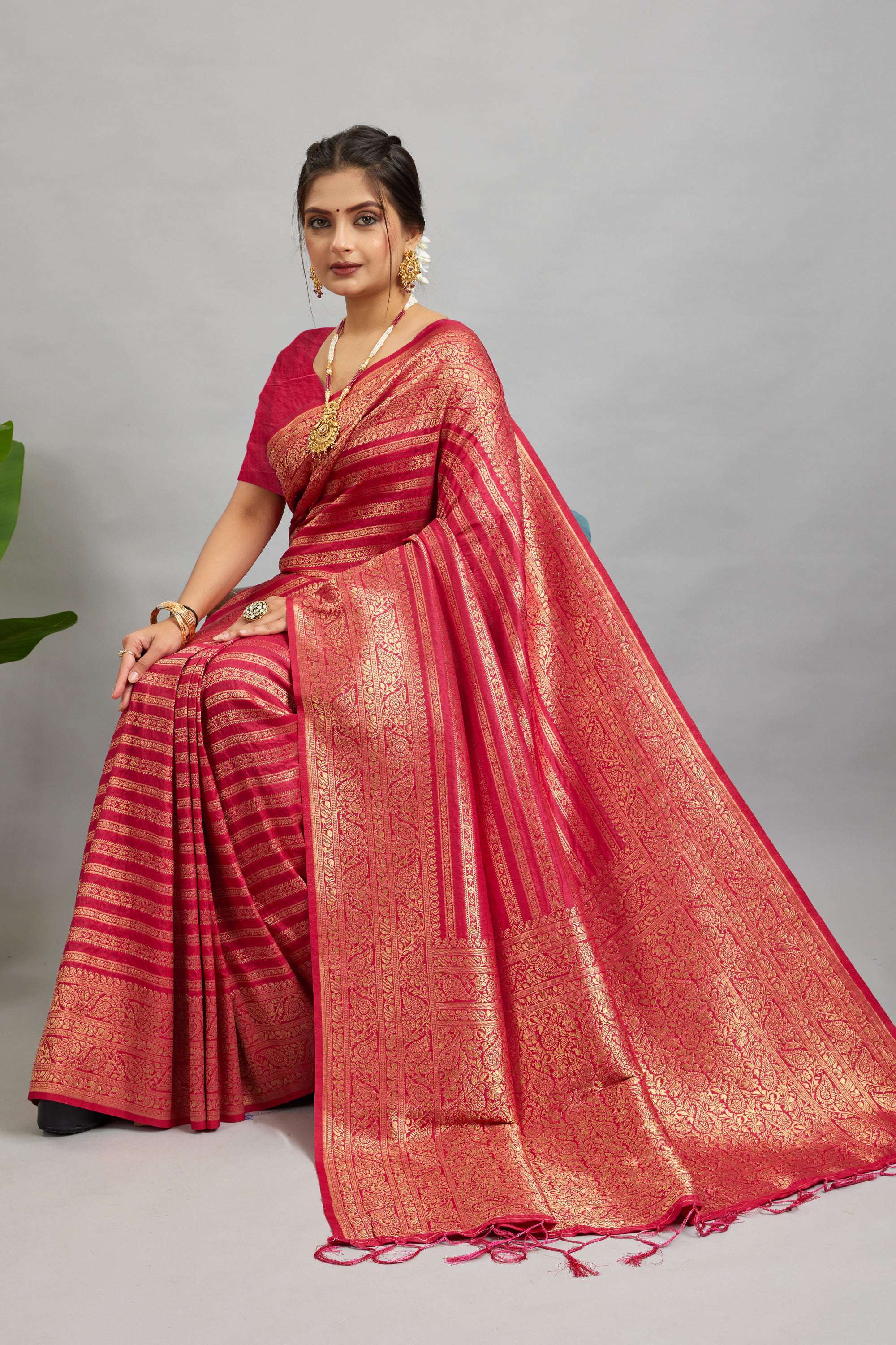 Experience timeless elegance with this Pure Soft Woven Khadi Silk Saree, featuring a rich zari-woven pallu adorned with fancy tassels. The saree is enhanced with a heavy woven border and intricate all-over zari weaving, making it a perfect choice for festive occasions and celebrations. Paired with a running blouse, this ensemble beautifully blends tradition with sophistication.