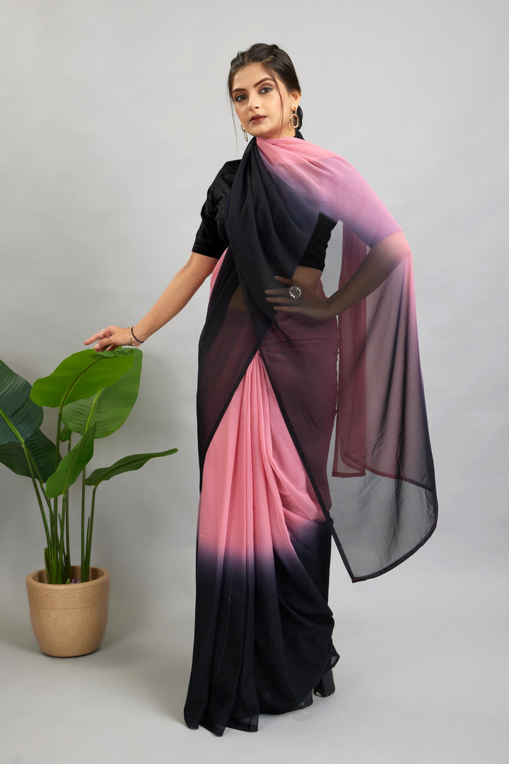 Turn heads effortlessly with this two-toned soft Georgette saree, designed to drape flawlessly in just 1 minute. Paired with a rich Bangalori Satin blouse, it blends luxury, style, and convenience into one stunning ensemble. Perfect for festive celebrations, parties, or any formal occasion, this saree brings instant elegance to every moment.