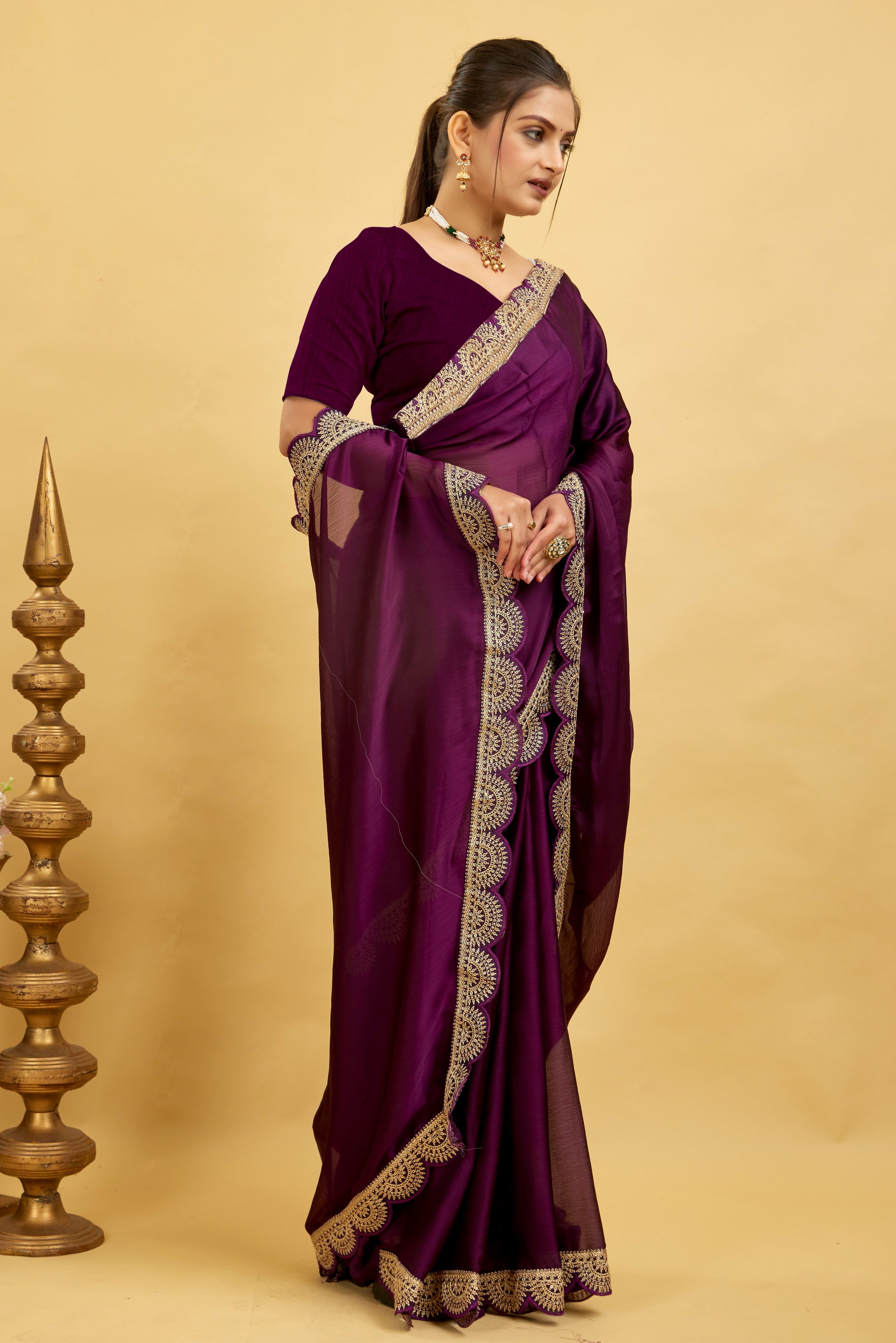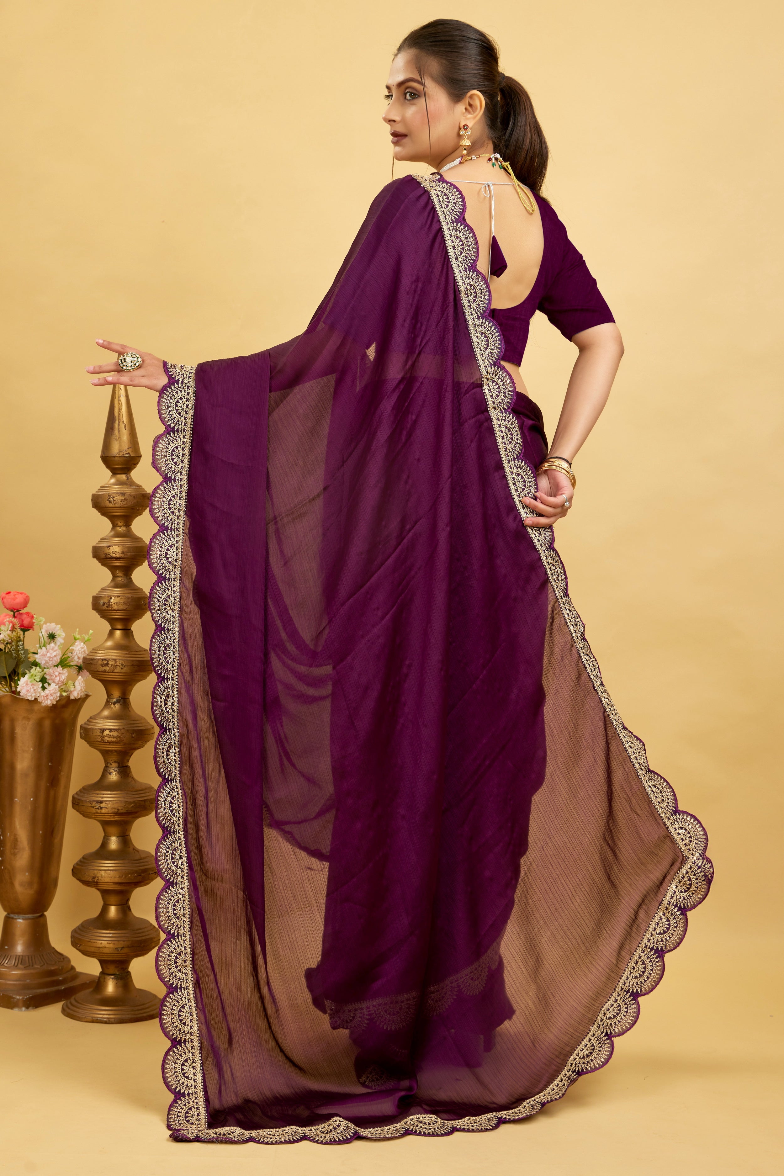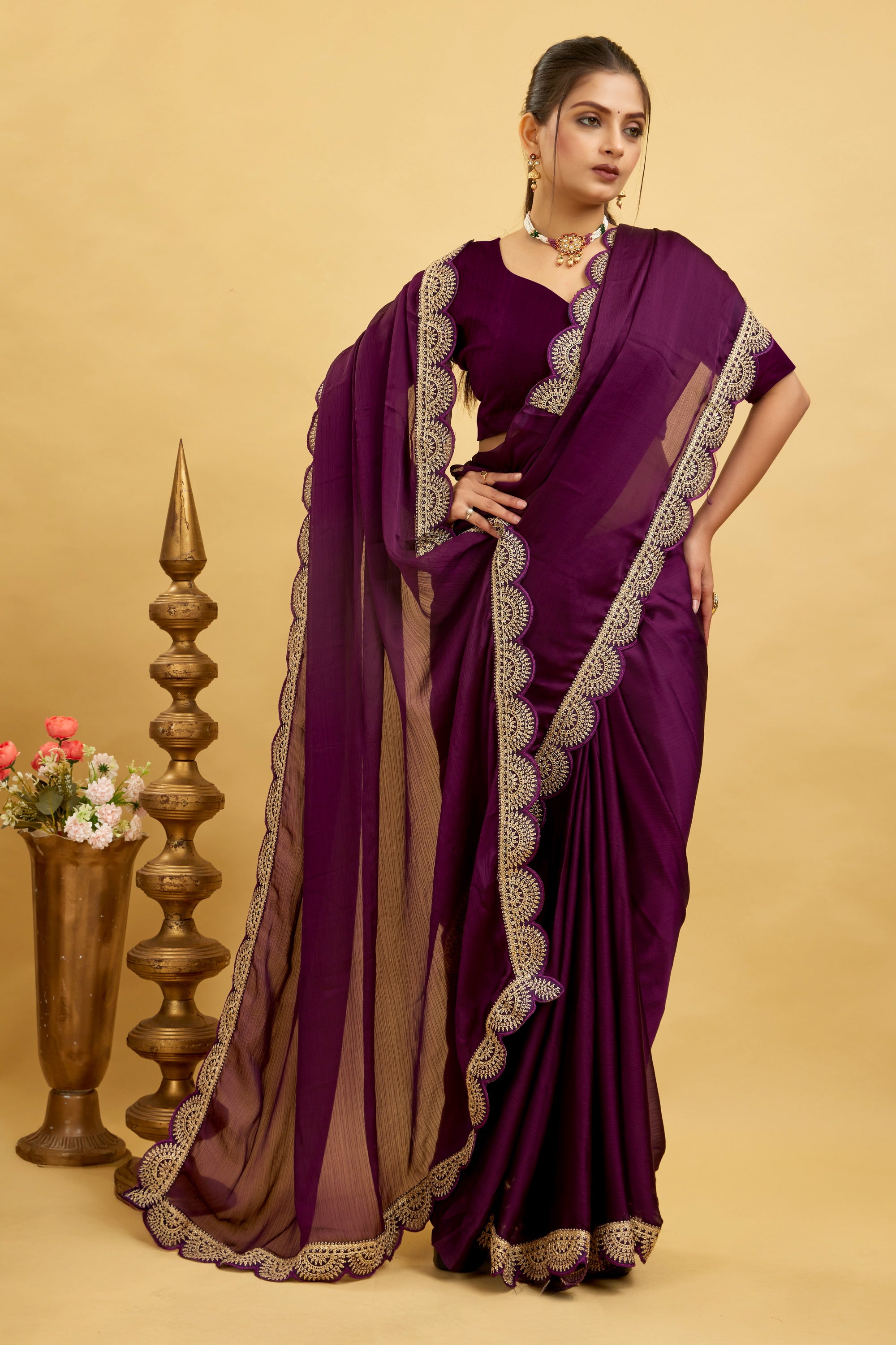Purple Embroidered Satin Chiffon Saree
