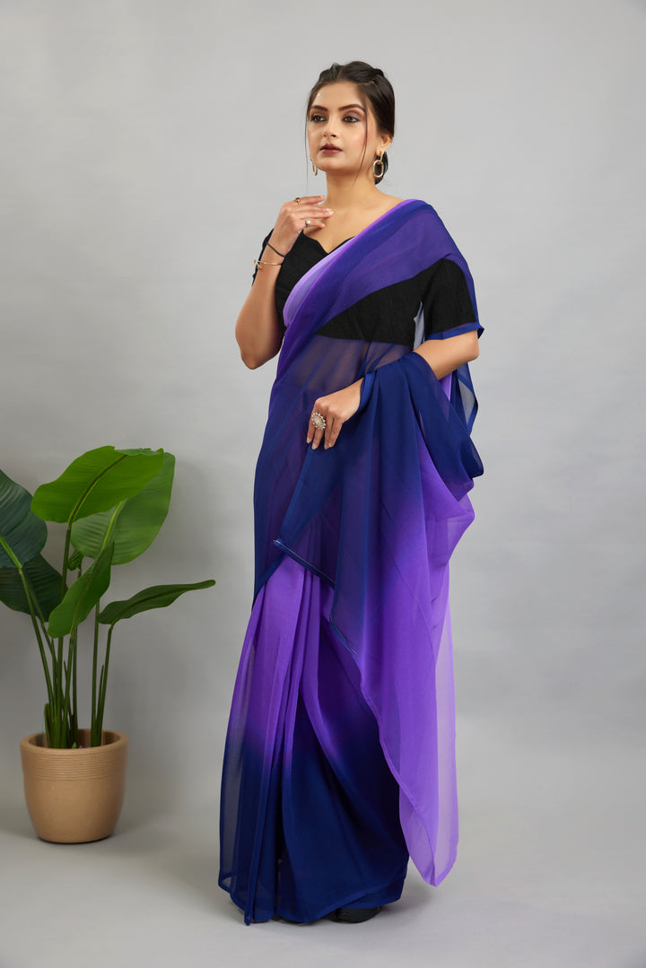 Turn heads effortlessly with this two-toned soft Georgette saree, designed to drape flawlessly in just 1 minute. Paired with a rich Bangalori Satin blouse, it blends luxury, style, and convenience into one stunning ensemble. Perfect for festive celebrations, parties, or any formal occasion, this saree brings instant elegance to every moment.