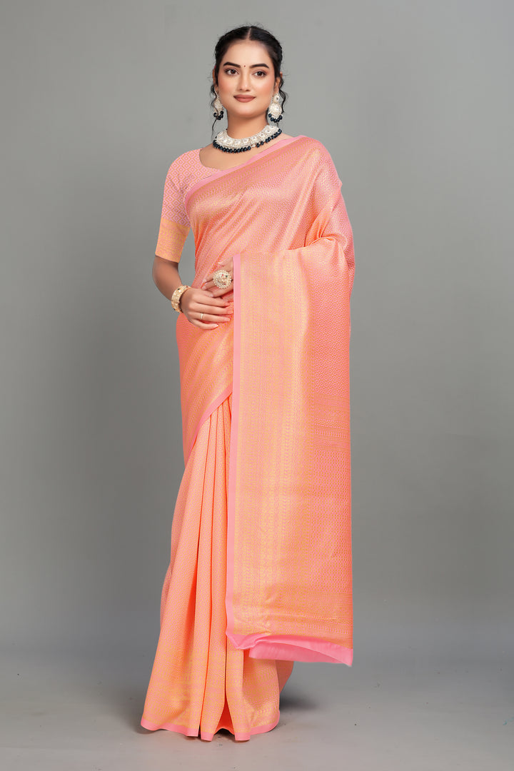 Experience elegance with this soft Silk Blend saree, featuring a rich pallu adorned with intricate jacquard work throughout. The exclusive blouse is enhanced by a refined jacquard border, adding a sophisticated touch to the ensemble. Ideal for special occasions, this saree combines traditional craftsmanship with luxurious comfort.