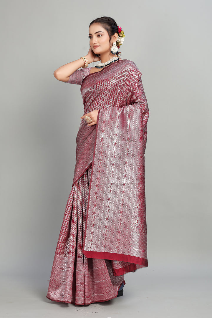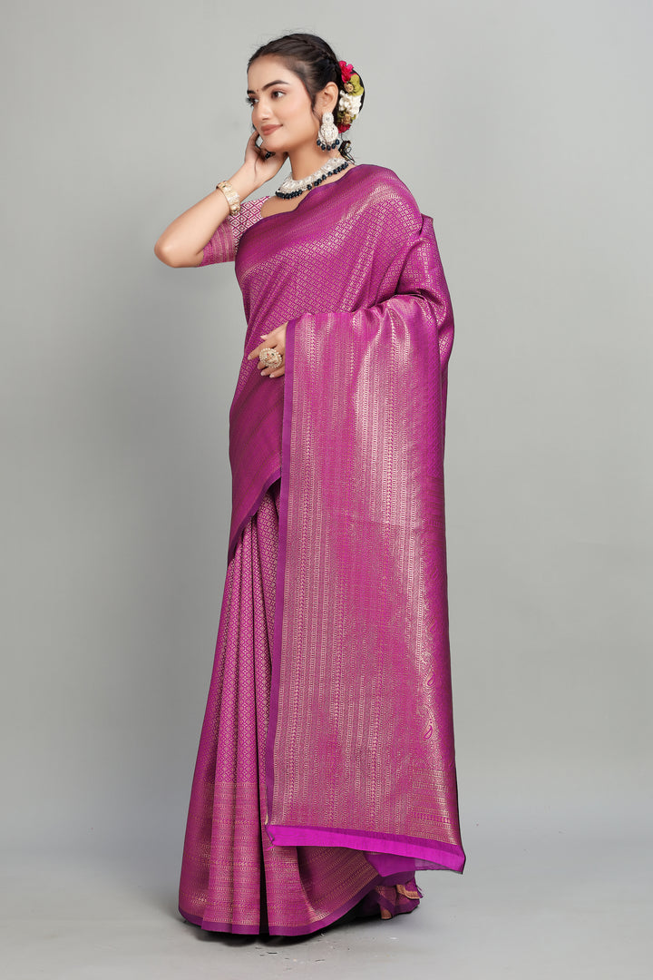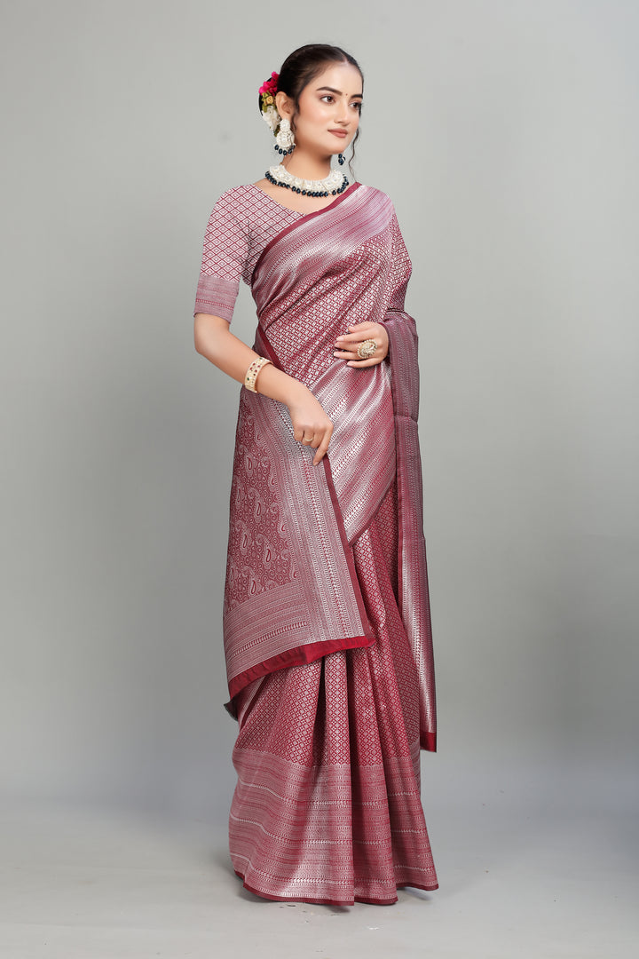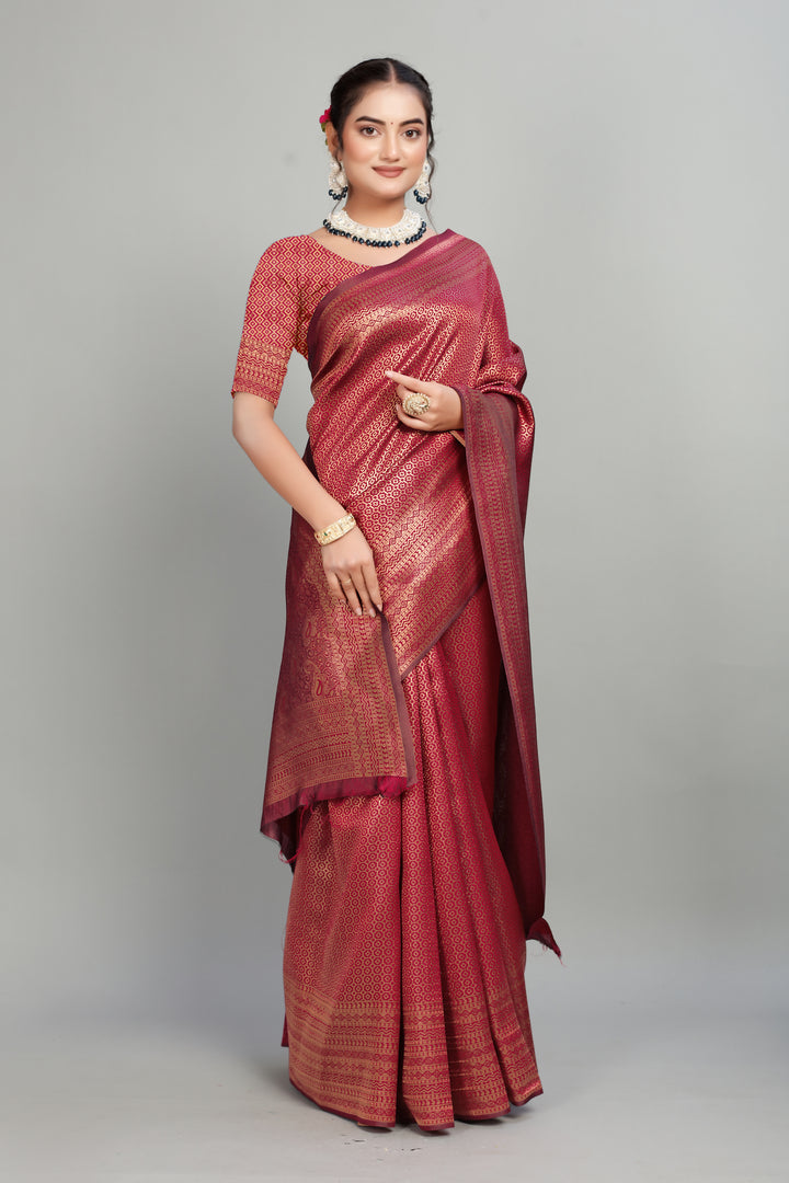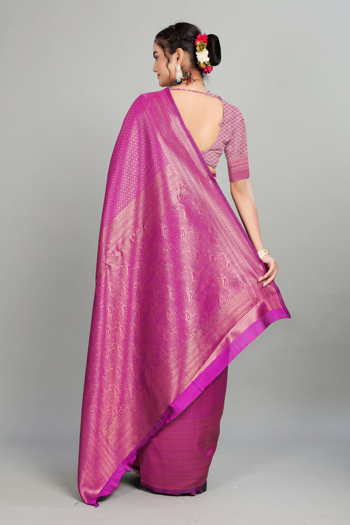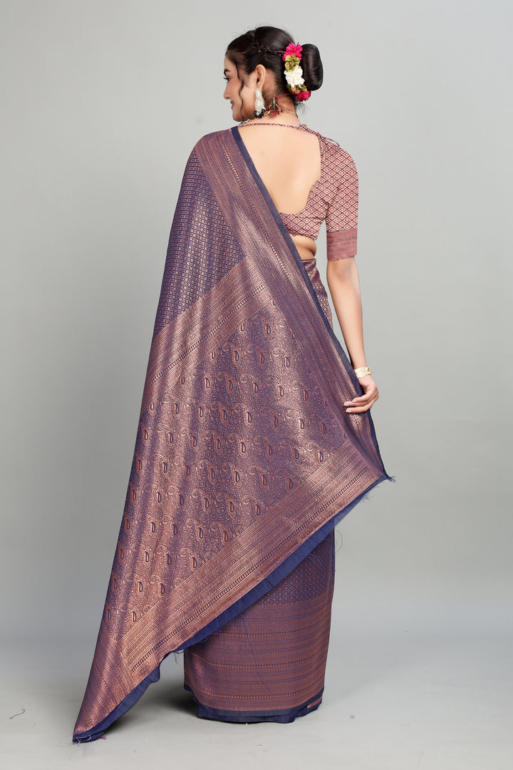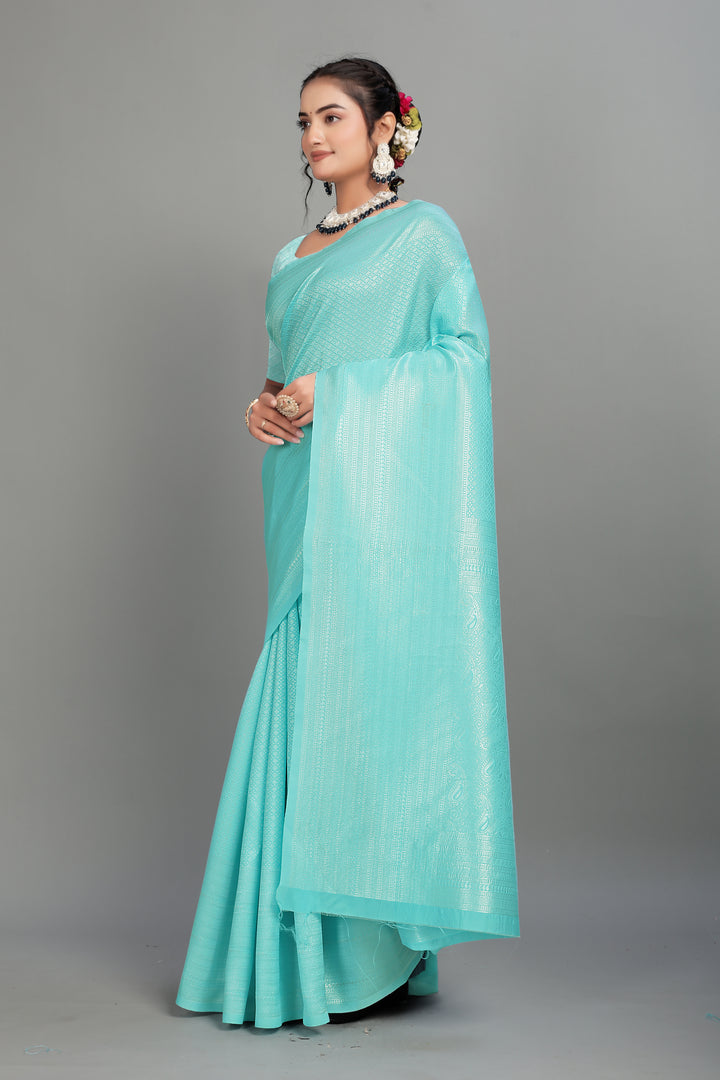 Experience elegance with this soft Silk Blend saree featuring a rich pallu and intricate jacquard work throughout. The exquisite design enhances its luxurious texture, making it perfect for special occasions. Complemented by a blouse with an exclusive jacquard border, this saree offers a refined and sophisticated look that stands out with quality craftsmanship.