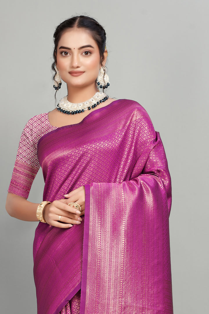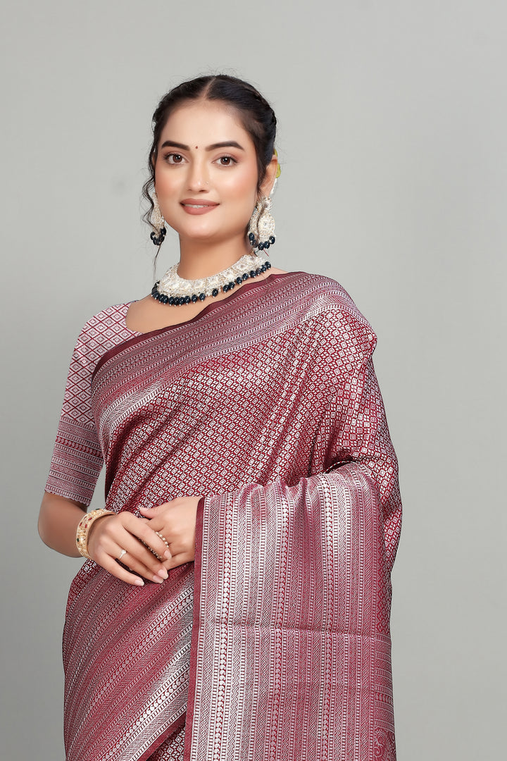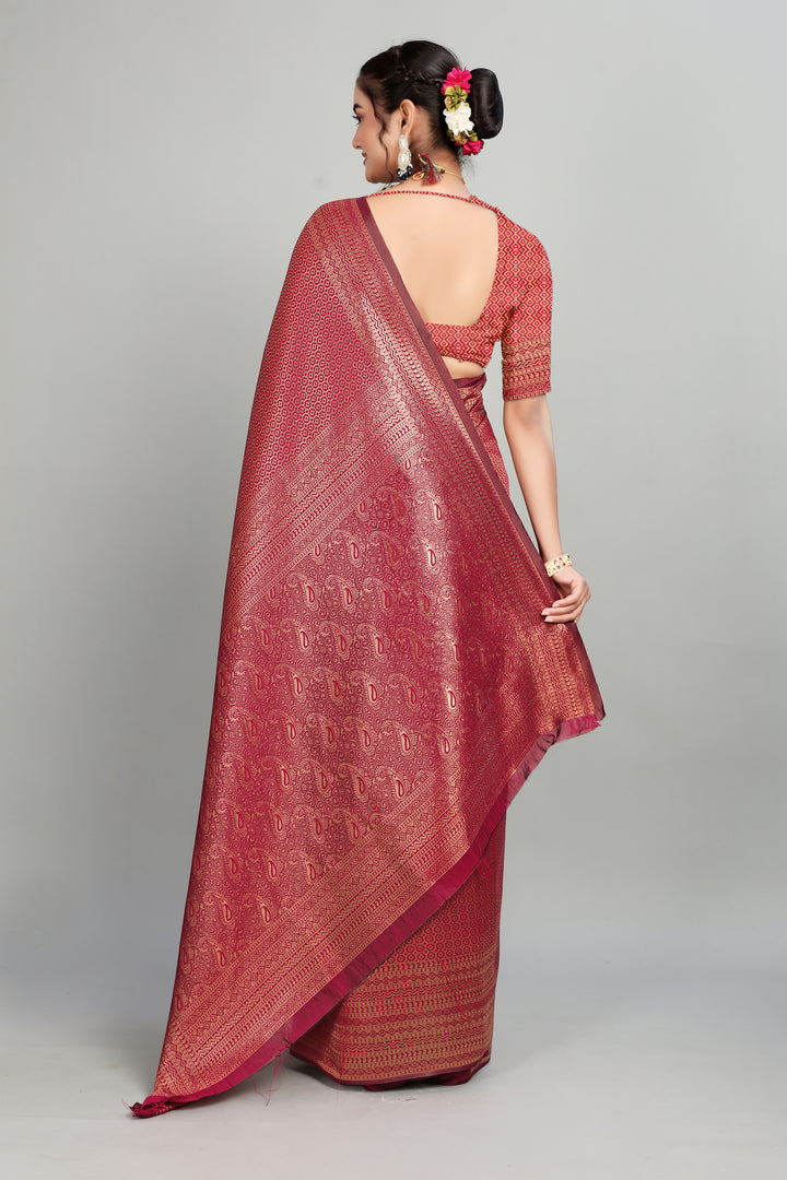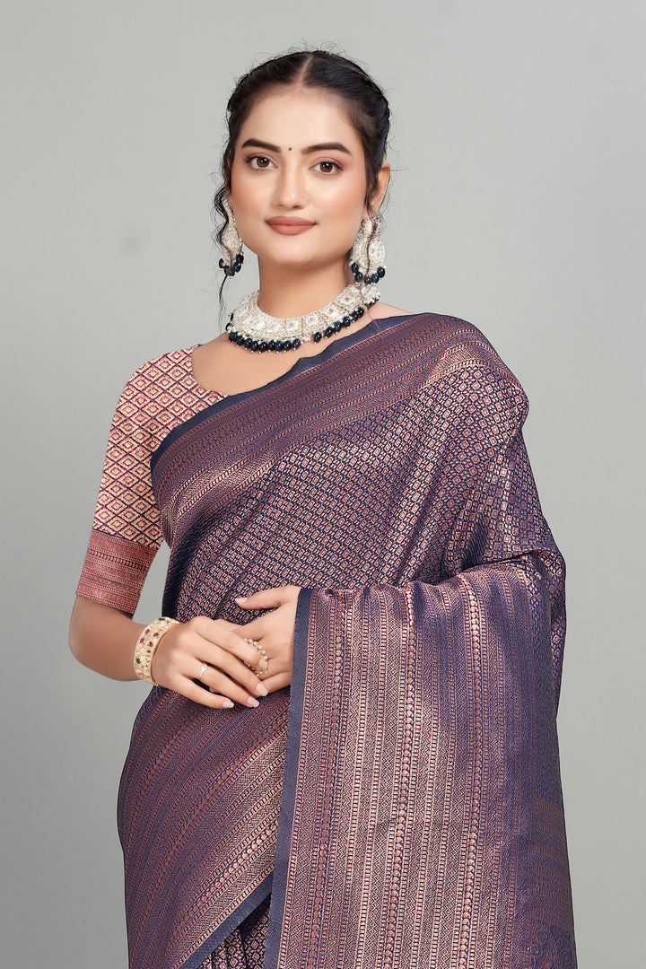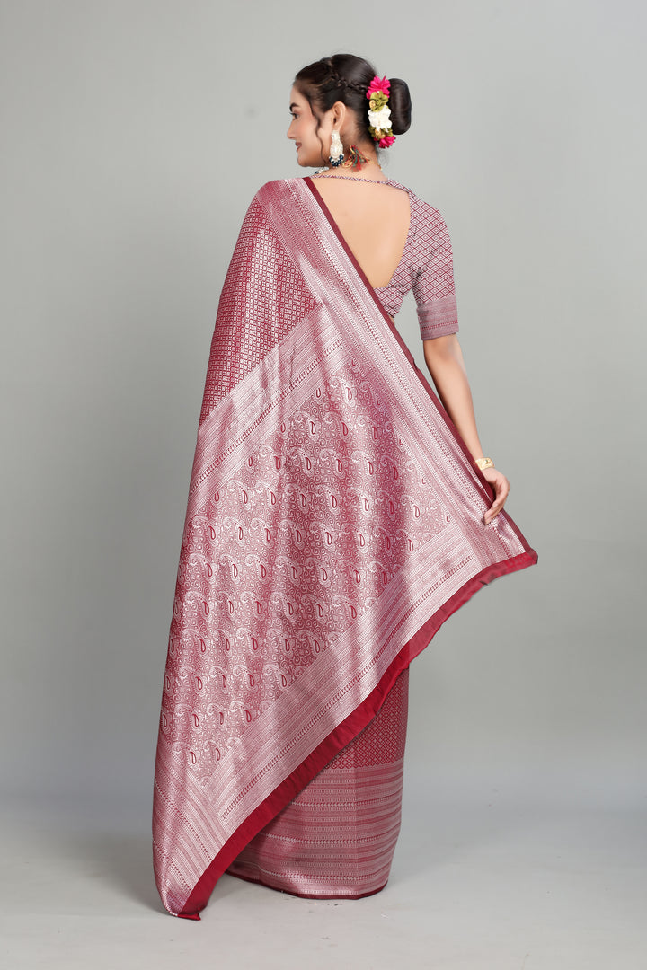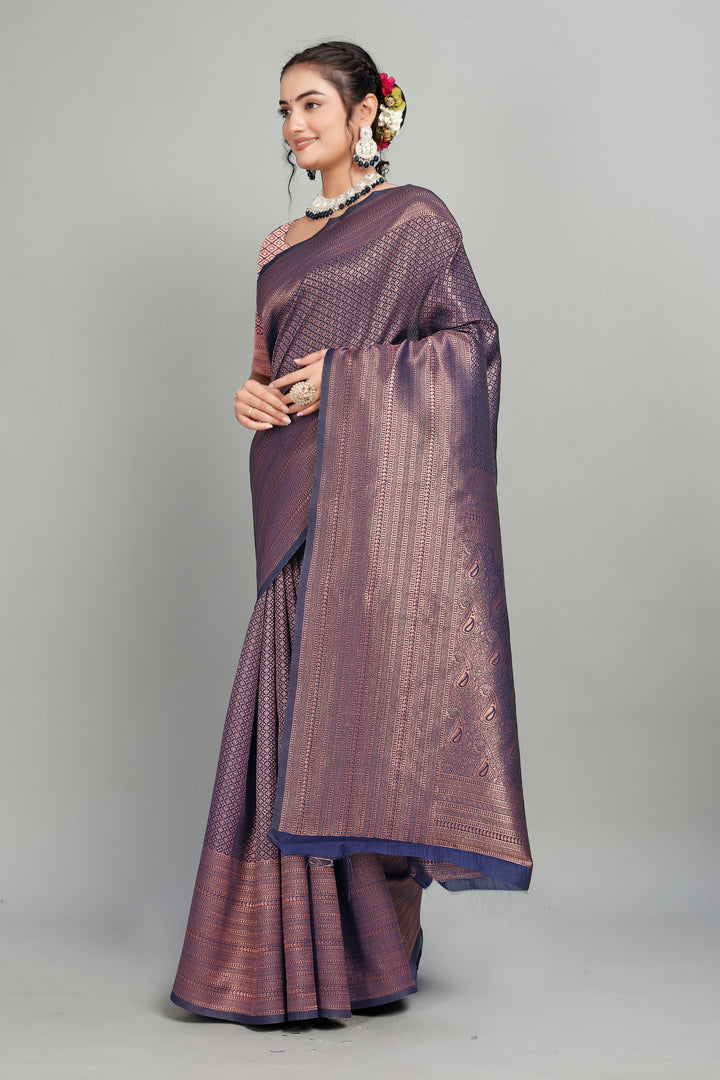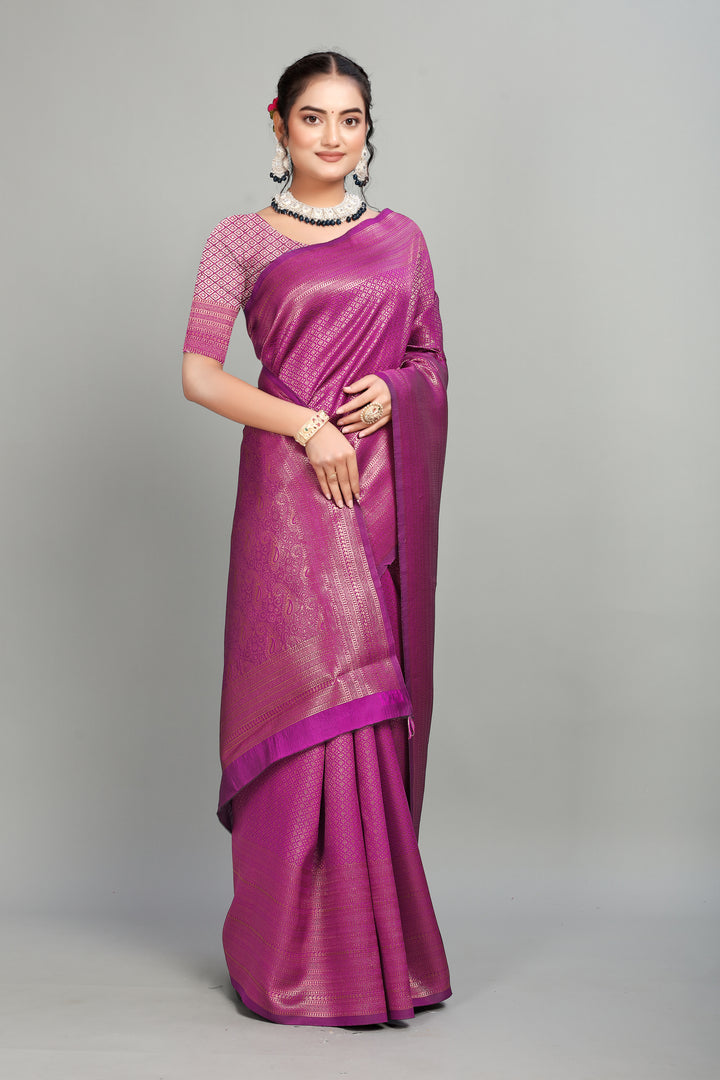 Experience elegance with this soft Silk Blend saree featuring a rich pallu and intricate jacquard work throughout. The exquisite design enhances its luxurious texture, making it perfect for special occasions. Complemented by a blouse with an exclusive jacquard border, this saree offers a refined and sophisticated look that stands out with quality craftsmanship.