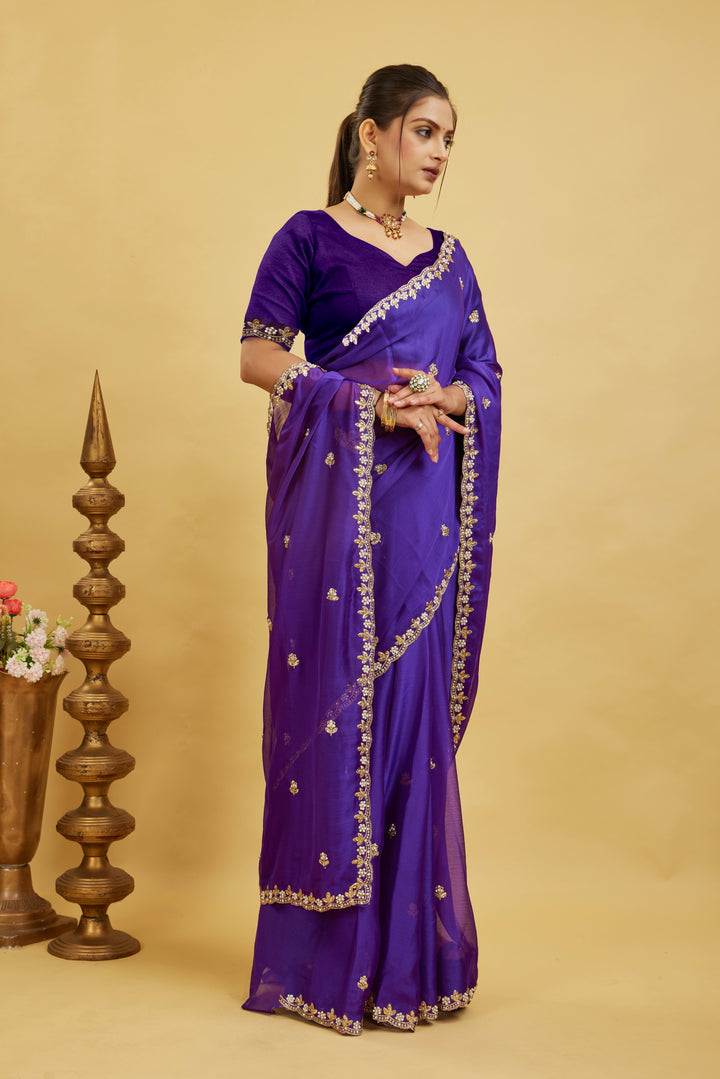 Experience elegance with this Chiffon Embroidered Saree, featuring intricate multi-embroidery work that adds depth and sophistication to your look. Paired with a finely detailed running work blouse, this ensemble combines delicate craftsmanship with lightweight comfort, making it perfect for formal occasions and celebrations. The breathable chiffon fabric ensures graceful draping, highlighting your silhouette with ease and refinement.