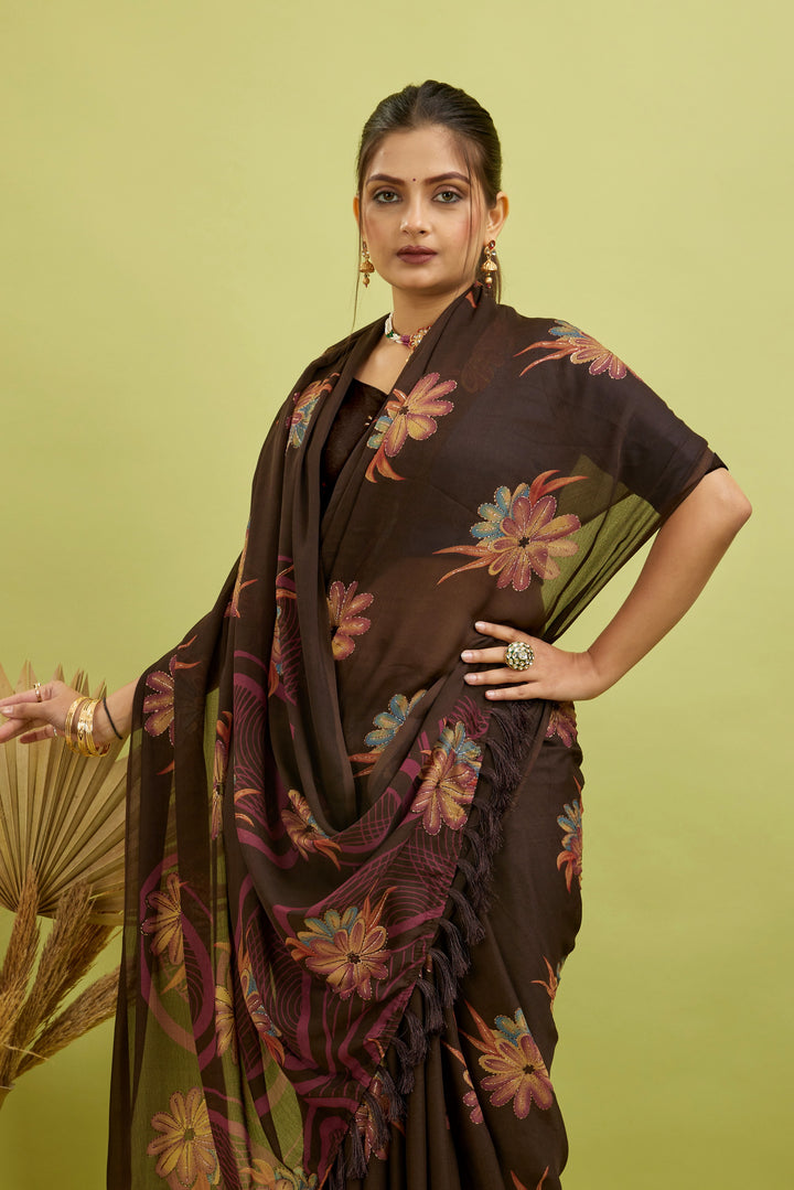 Celebrate tradition with a modern touch with this Bright Moss Satin Patta Printed Saree. Crafted from premium Bright Moss Satin Patta fabric, it features a vibrant print enhanced with delicate zari work, offering a sophisticated and refined look. The matching blouse, made from the same high-quality fabric, ensures a seamless and polished ensemble. Perfect for formal occasions, festive celebrations, or special events, this saree combines elegance, comfort, and timeless style.