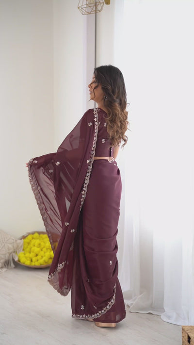 Wine Embroidered Georgette Lace Saree